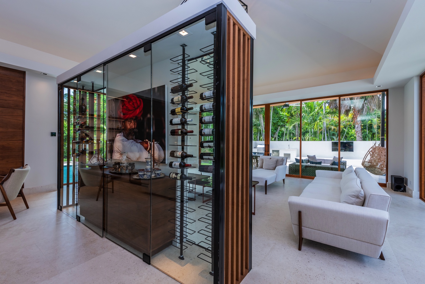 The villa’s interiors and terraces are thoughtfully integrated, allowing indoor and outdoor spaces to flow effortlessly. Lounge under swaying palms, relax on hand-carved Balinese furniture, or enjoy cocktails and meals at the veranda. The heated, floodlit pool invites day-to-night enjoyment, while the gourmet kitchen and outdoor grill make entertaining effortless. Inside, polished marble floors, natural wood accents, and curated Balinese décor create a calm, stylish retreat. Multiple living areas, including a TV lounge, provide quiet corners or festive spaces for social gatherings.