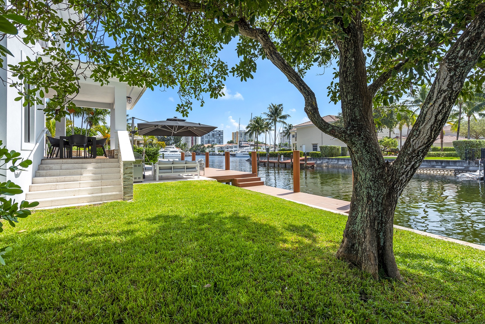 Outdoors, the Villa embodies South Florida’s lifestyle with a resort-style pool, elegant lounge areas, and a waterfront dining space perfect for alfresco meals prepared by one of our private chefs. As the sun sets, the reflections on the water and soft lighting around the pool create a truly magical ambiance.