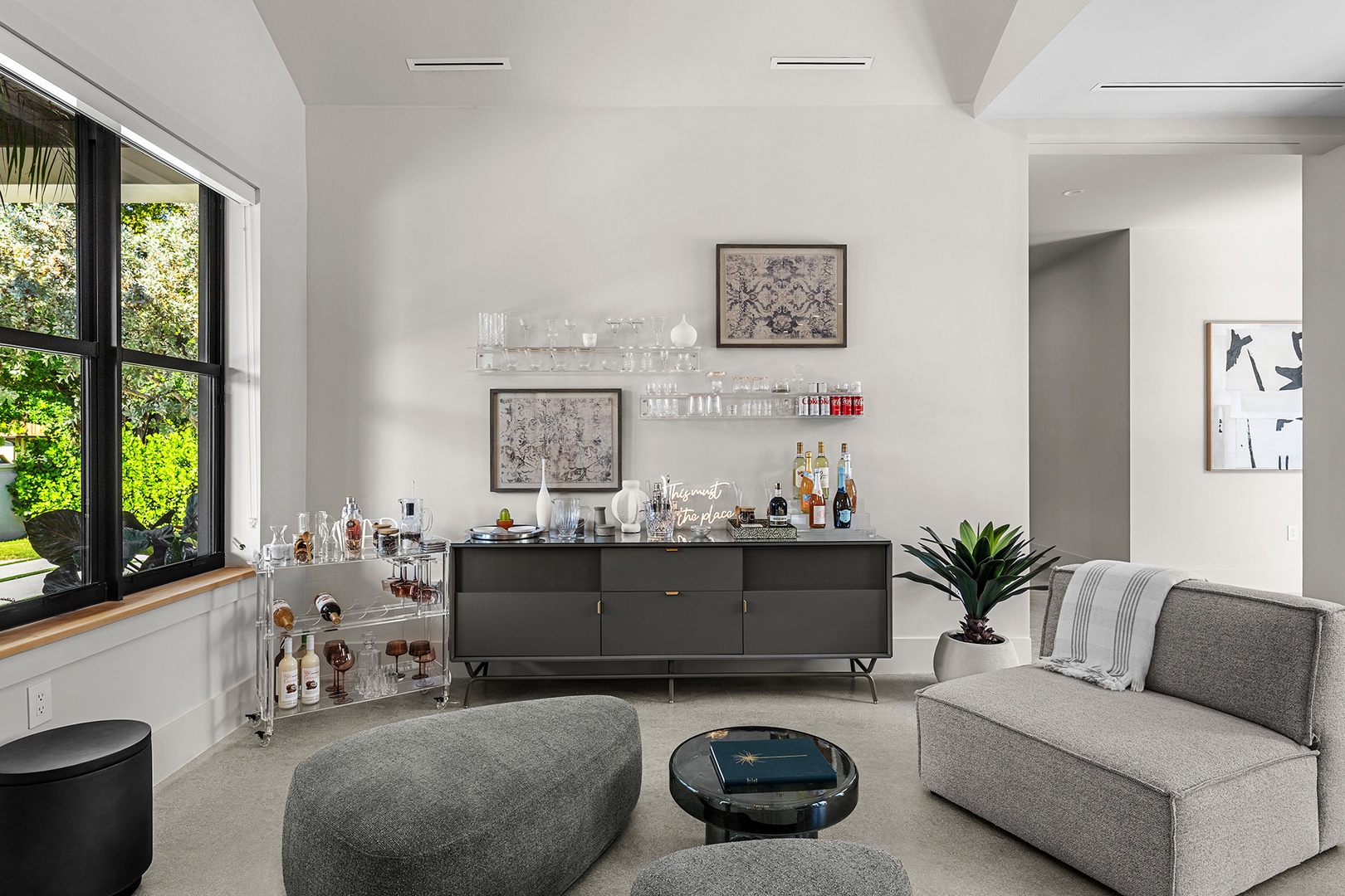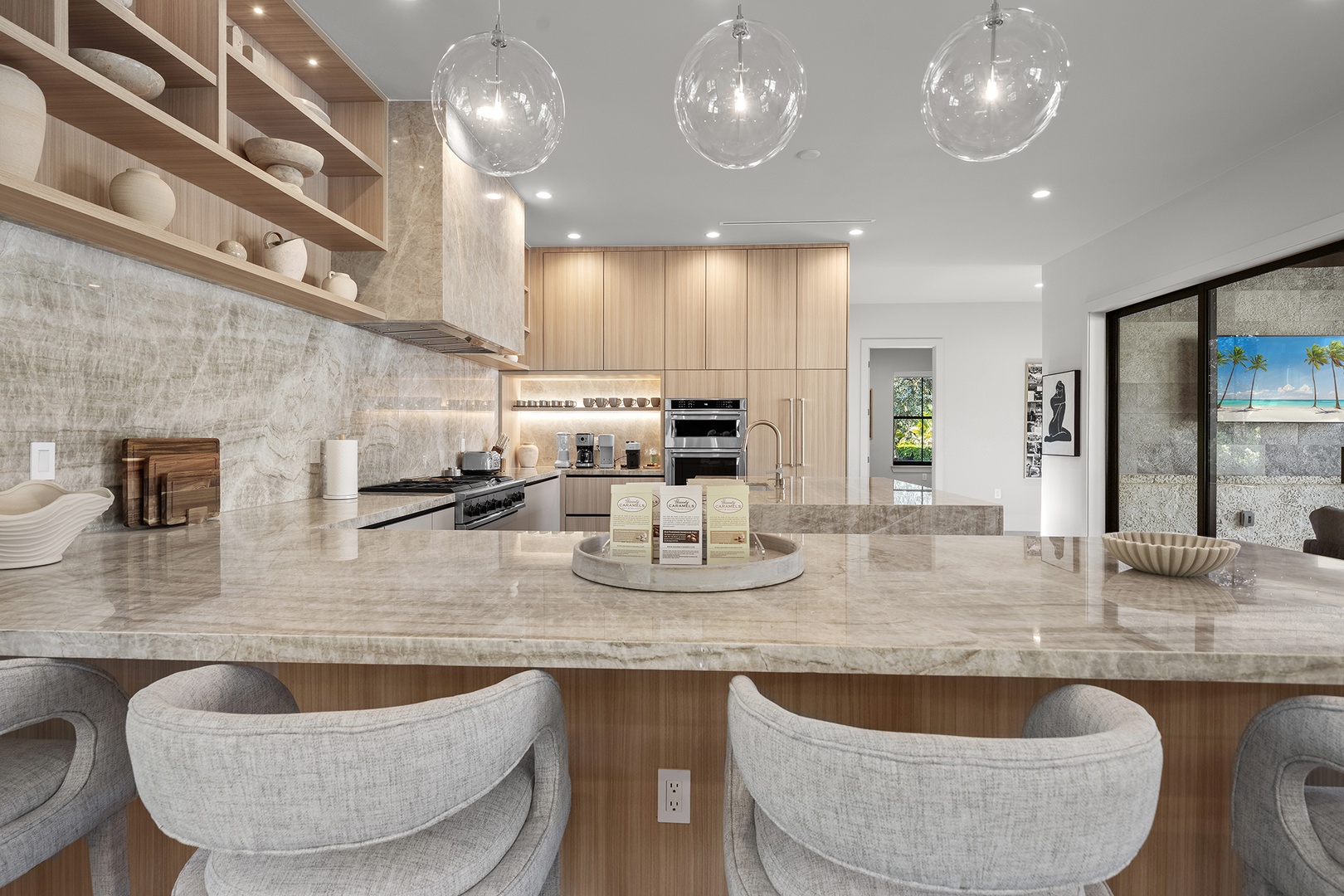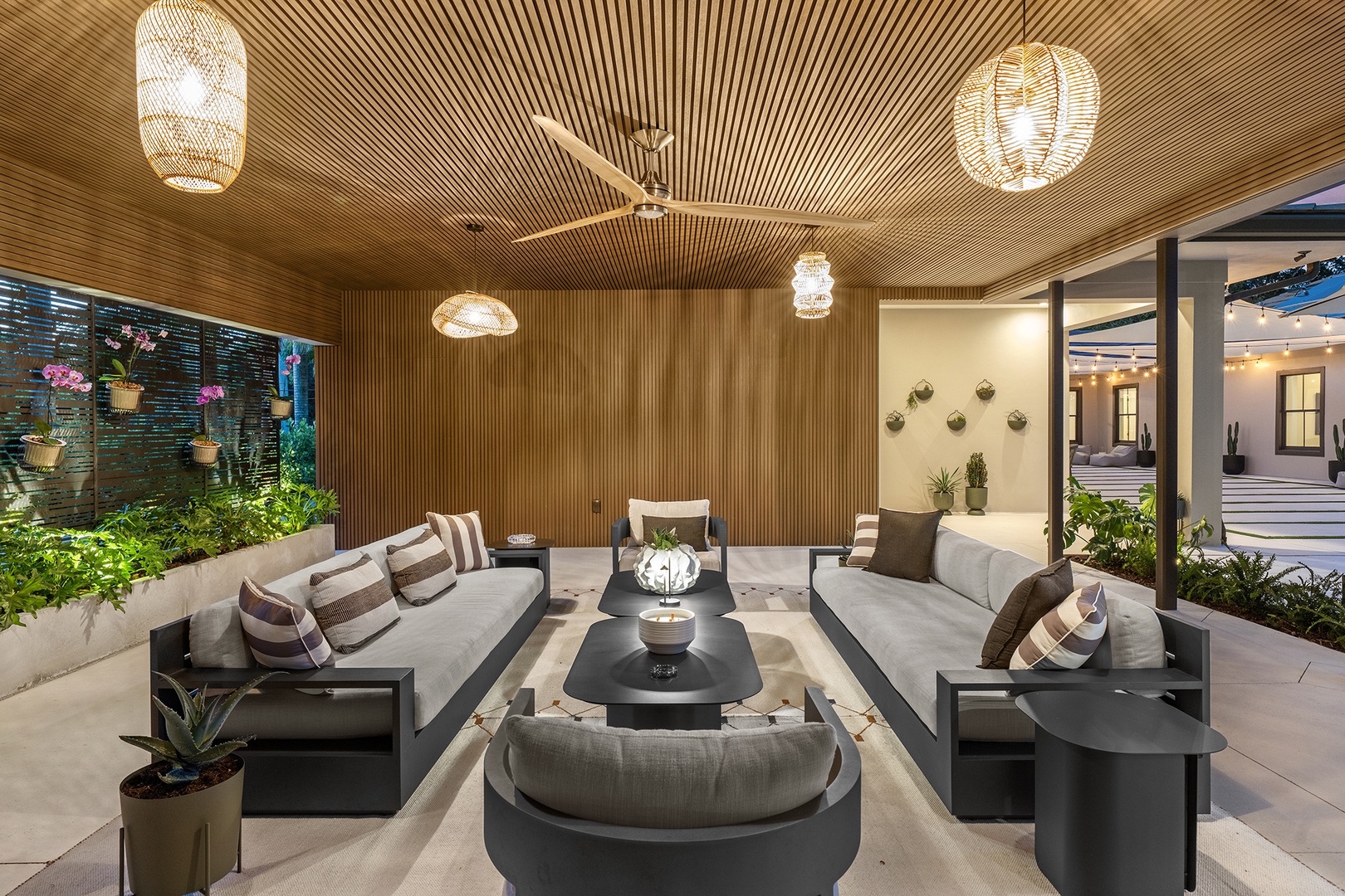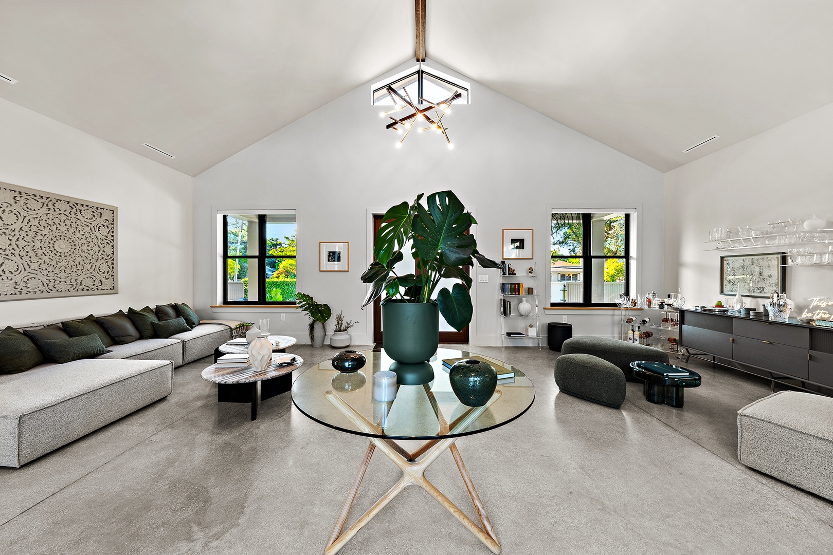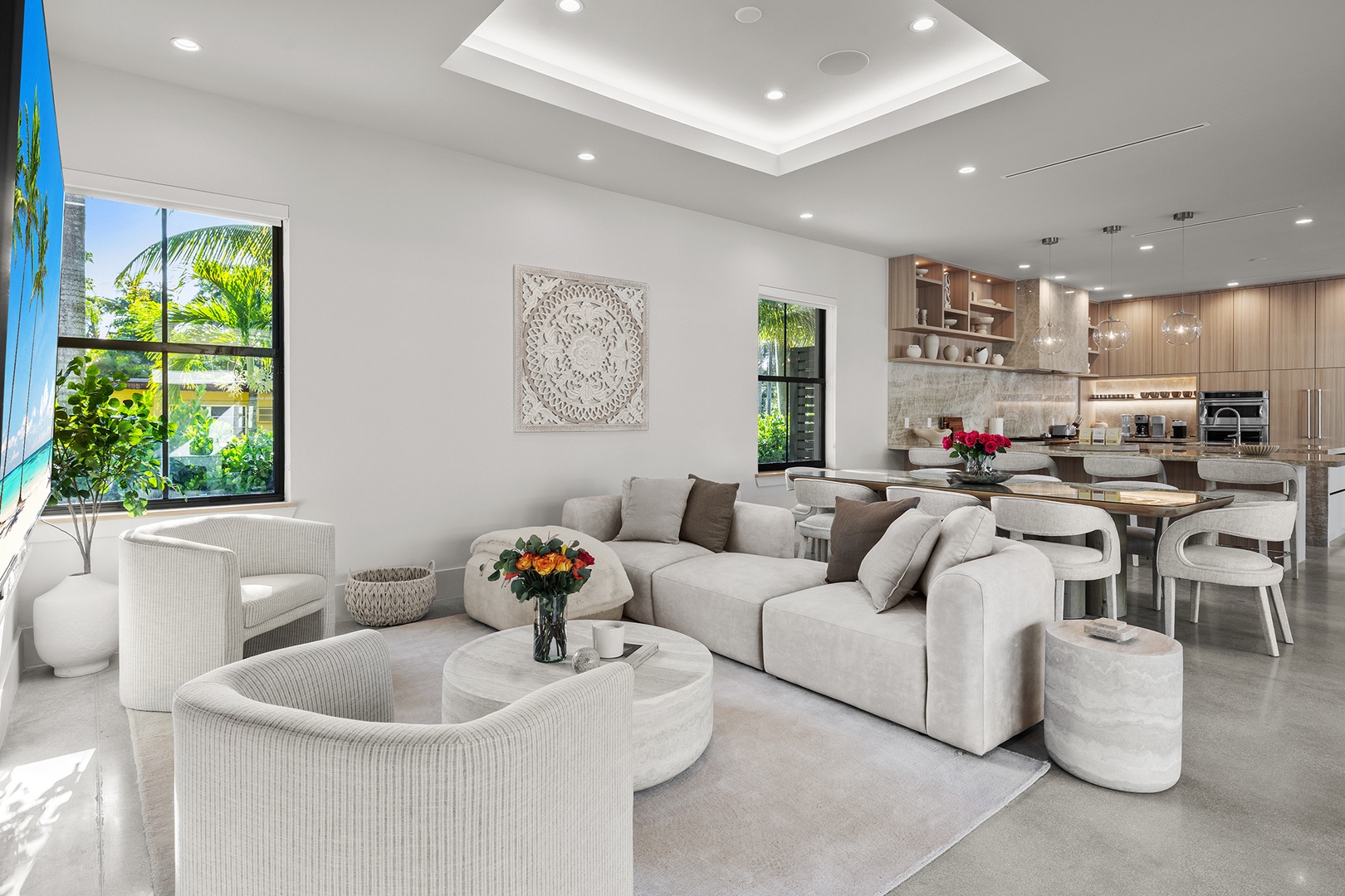 The residence features expansive open living spaces, modern furnishings, and seamless indoor-outdoor flow. yle living and residential tranquility.
