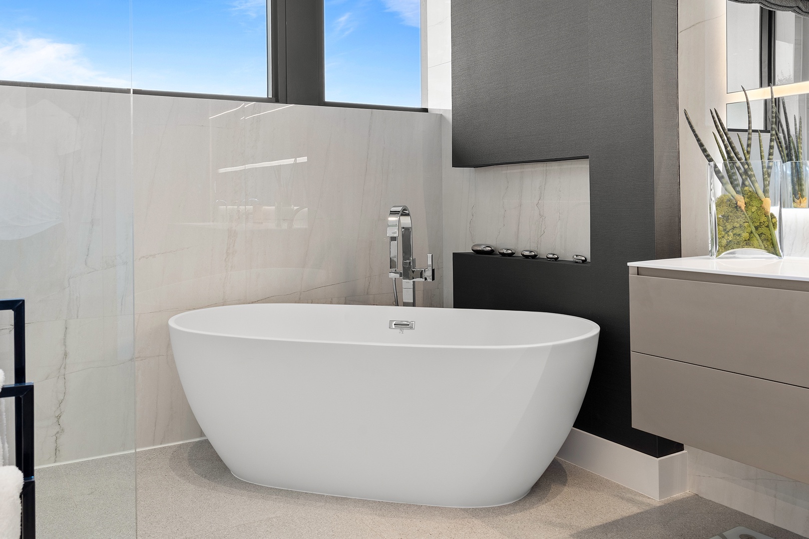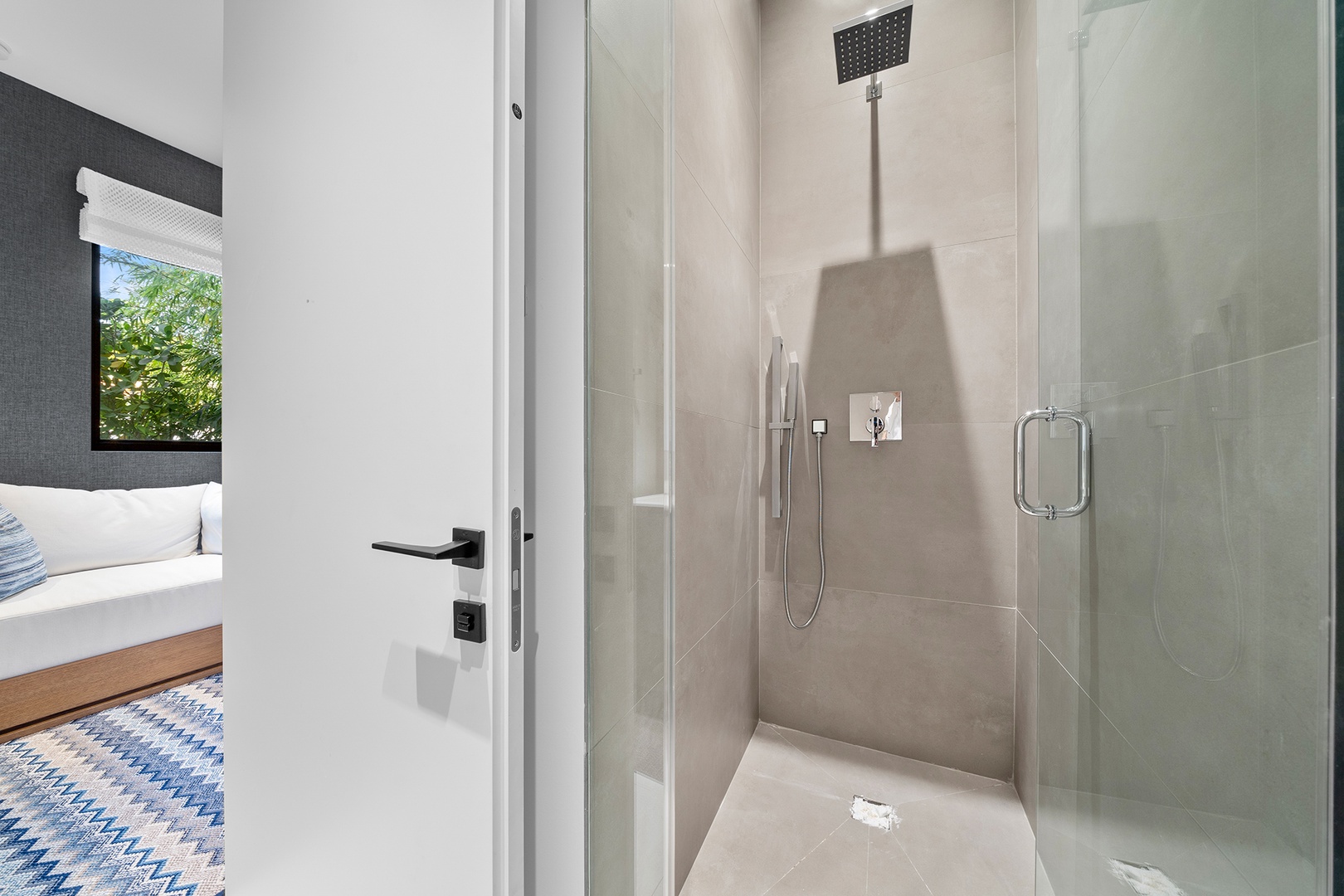 The first floor includes a versatile guest suite, while the second level offers spacious bedrooms, each with its own en-suite bath. The primary suite serves as a private retreat with a large walk in closet and a serene terrace overlooking the backyard. Throughout the home, high ceilings, clean architectural lines, and contemporary finishes create a refined yet inviting atmosphere that elevates everyday living.