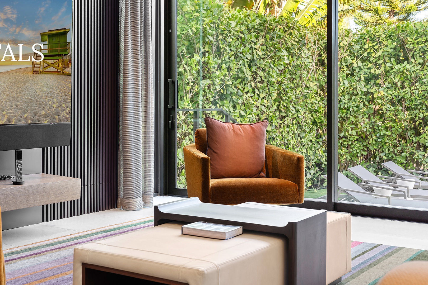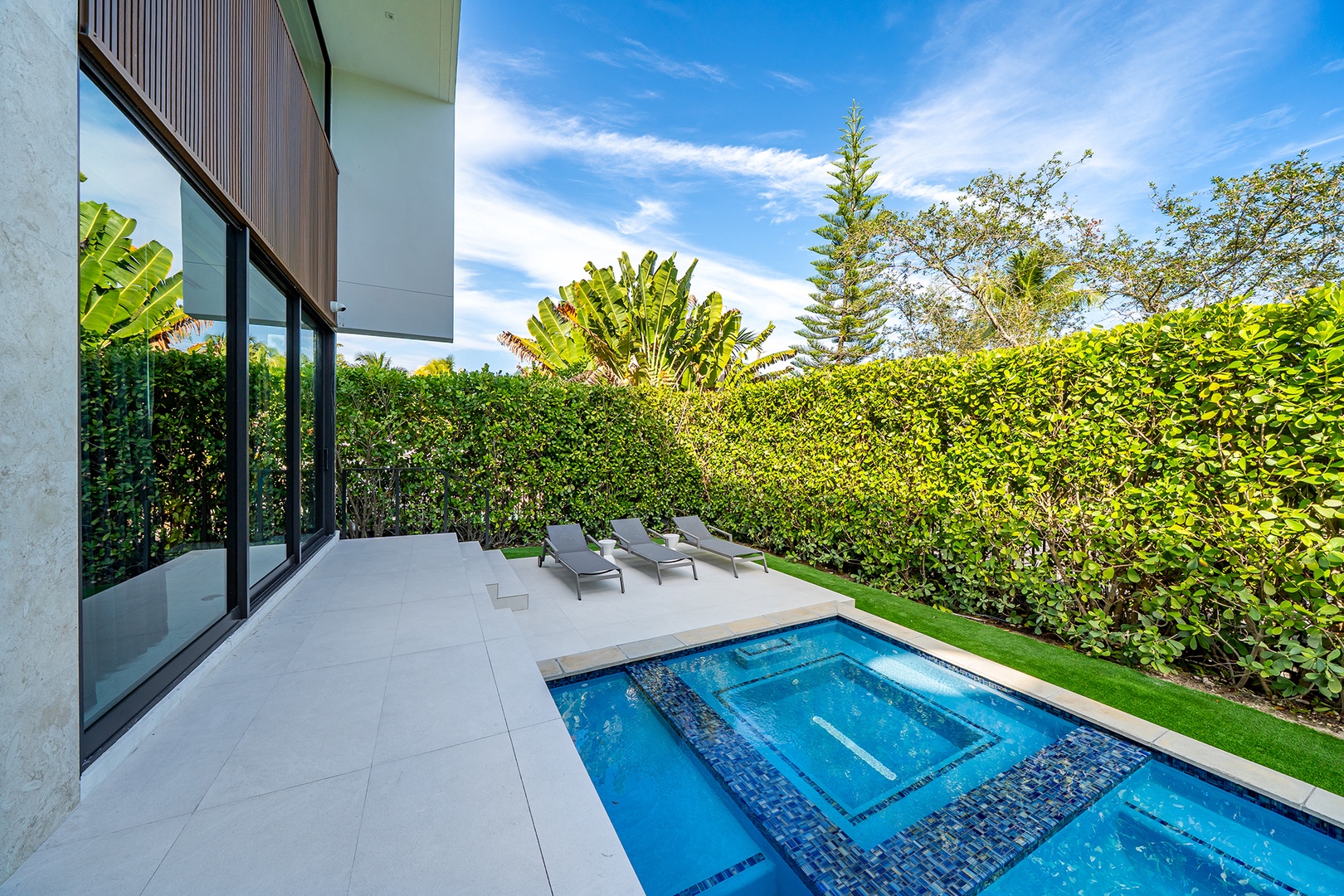 Outdoors, the villa features a private pool surrounded by lush landscaping, creating an ideal setting for relaxation, sunbathing, and entertaining.