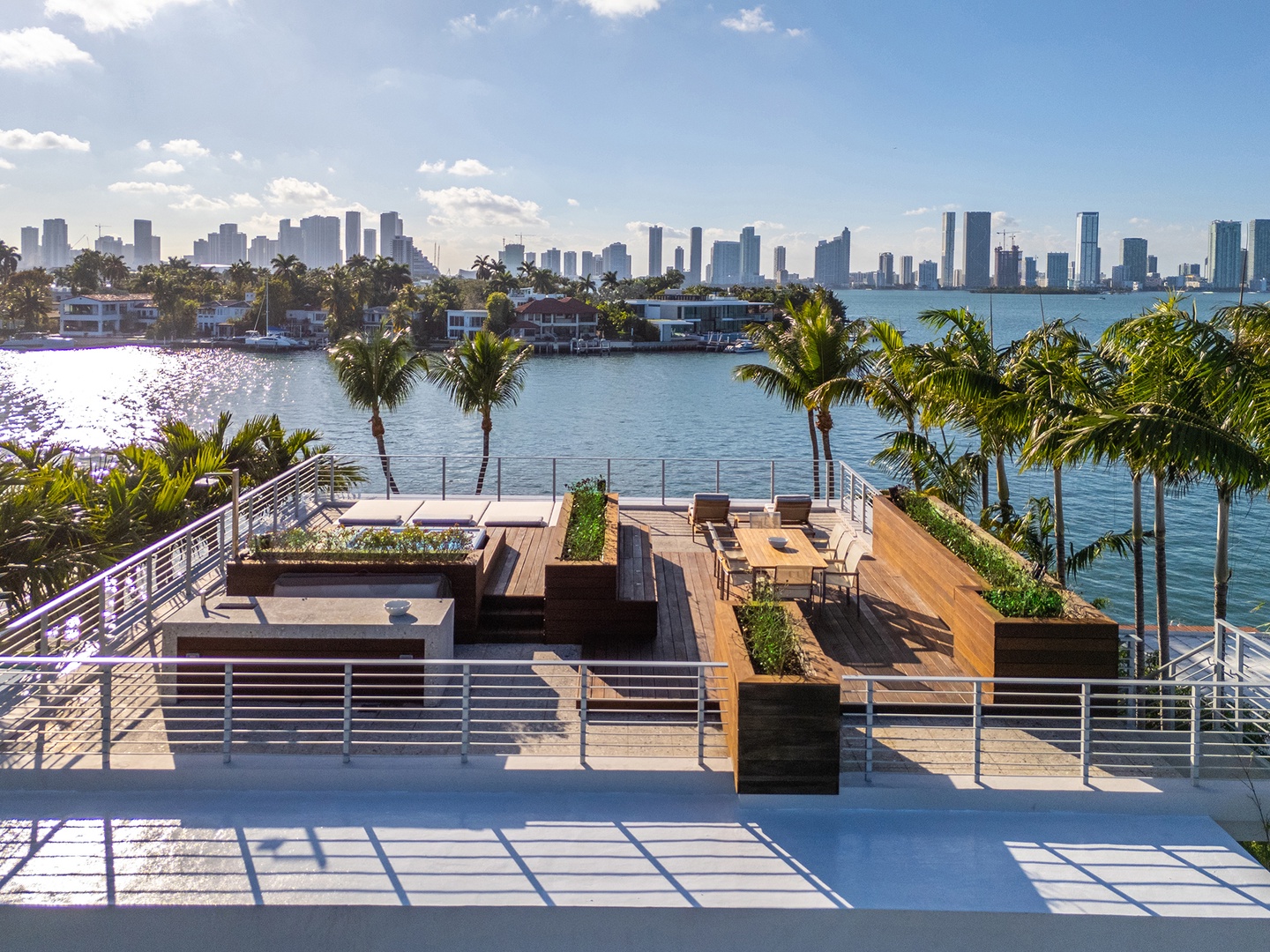 A standout feature is the rooftop terrace designed for entertainment and relaxation, featuring a private jacuzzi, outdoor shower, fully equipped outdoor kitchen, generous group seating, and chaise lounge chairs, all to enjoy the perfect Miami sunsets.
