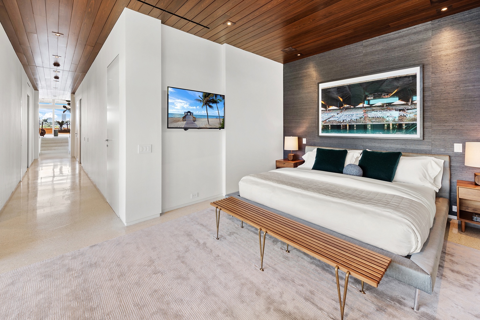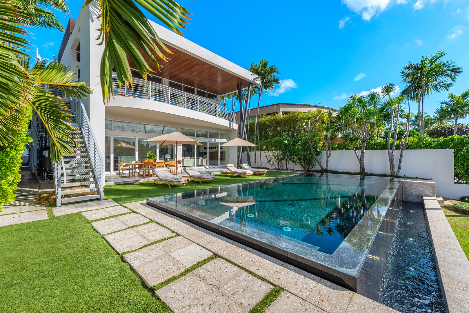 The residence offers five bedrooms and five and a half bathrooms, complemented by open-concept living and dining areas, a chef’s kitchen with marble finishes, and spa-inspired baths. The outdoor living is exceptional with a private saltwater pool, plush sunbeds, outdoor kitchen, waterfront deck private dock and lush palm-lined surroundings.