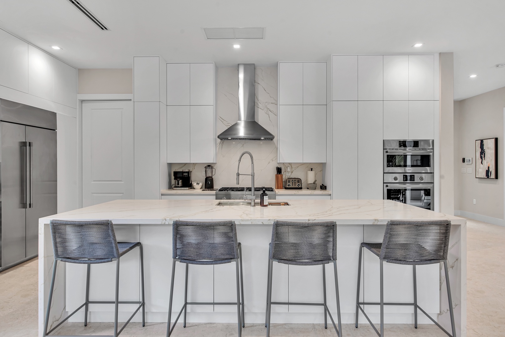 Walls of glass invite natural light throughout the home, creating a harmonious connection between indoor and outdoor living. The open-concept design features warm wood flooring and limestone accents, offering both comfort and refined style. The chef’s kitchen stands as a true centerpiece, featuring custom cabinetry, a dramatic 12-foot waterfall quartz island, and premium stainless-steel appliances including a built-in micro and oven combo, cooktop, wall hood, dishwasher, and wine cooler, ideal for hosting private dinners and entertaining in style.