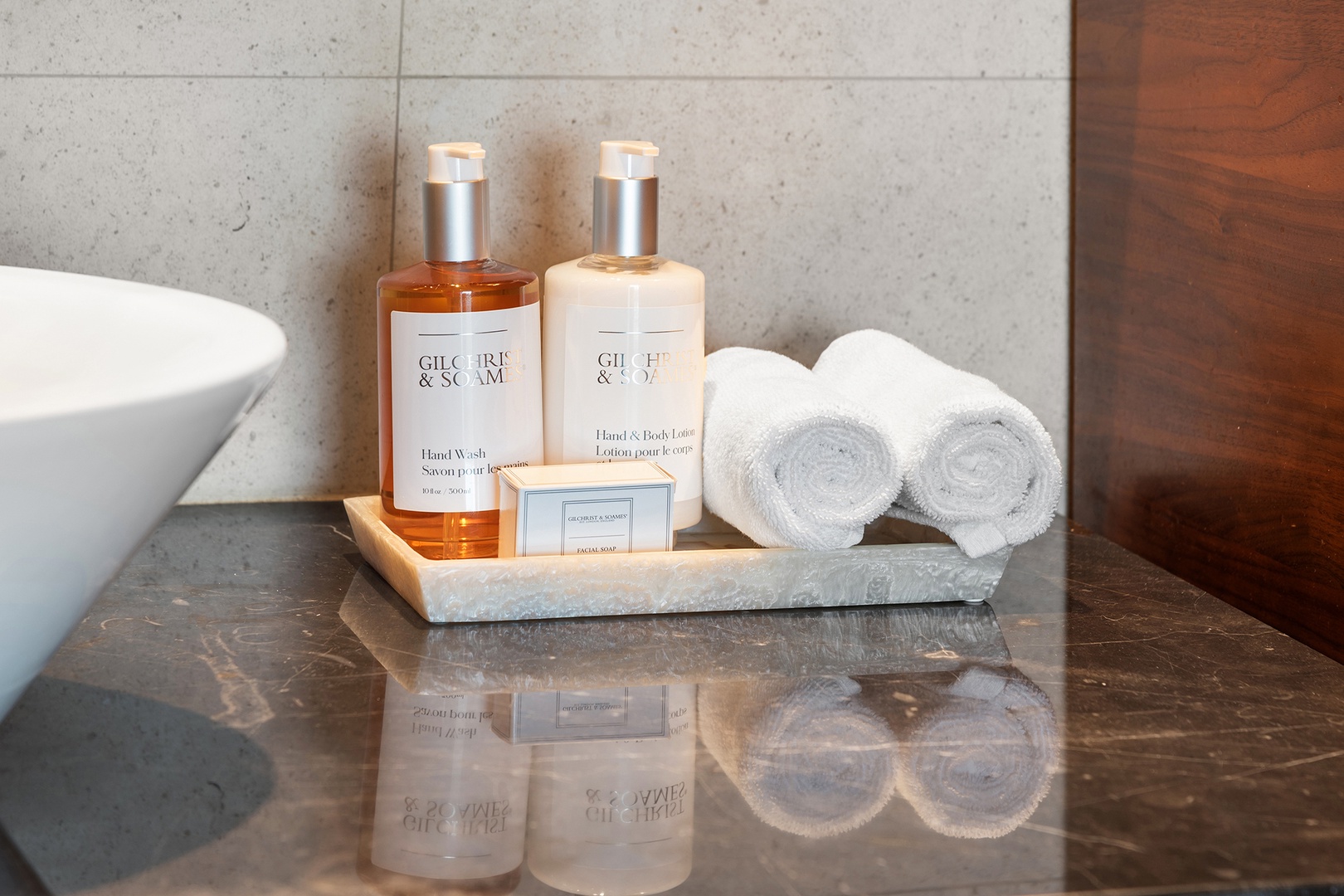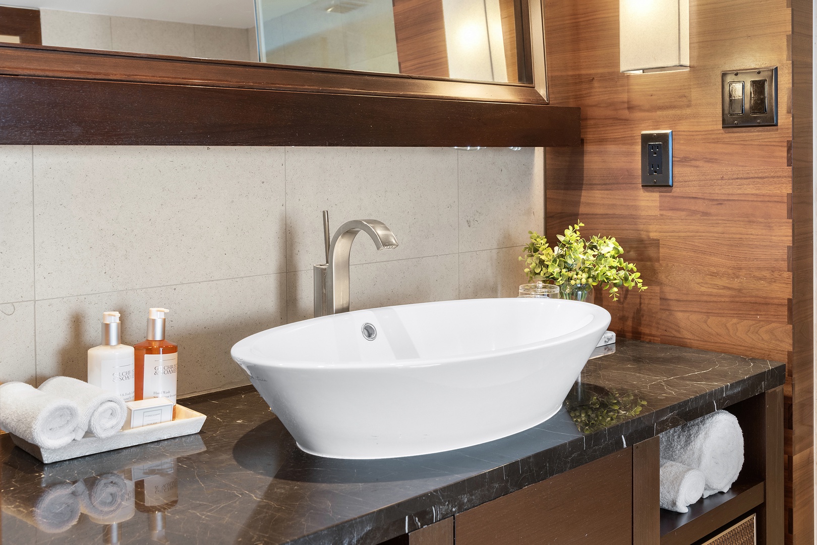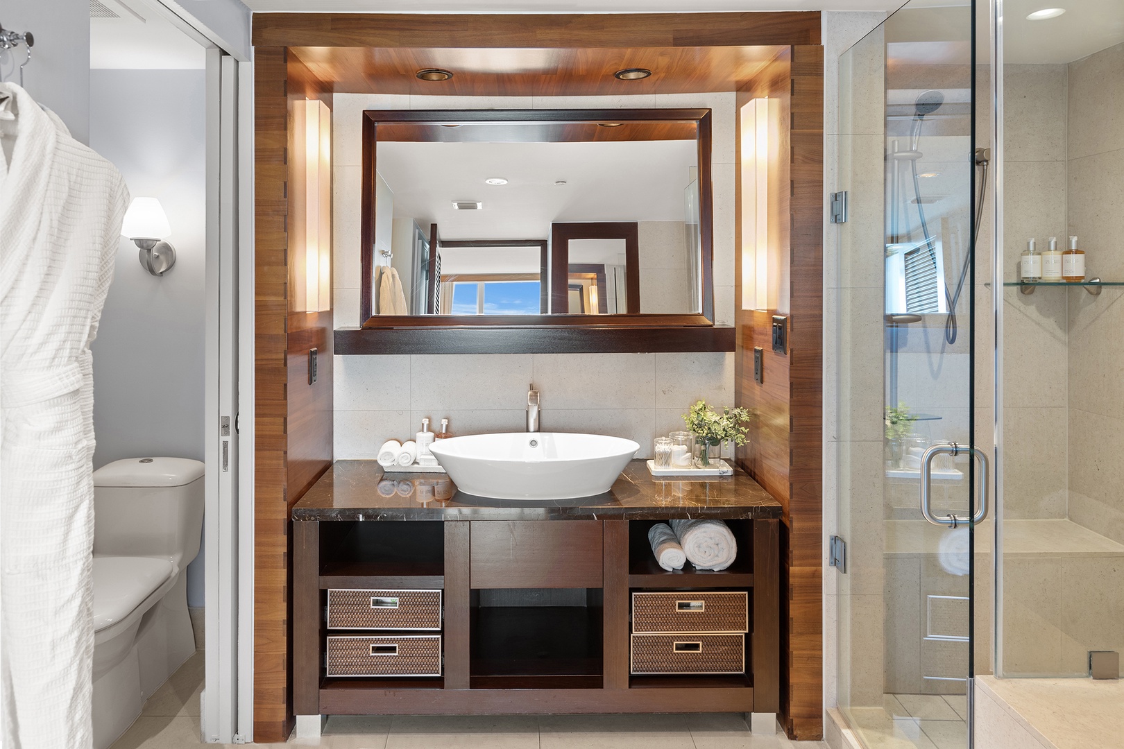 • Bathrooms are fully stocked with premium hotel room amenities and toiletries.