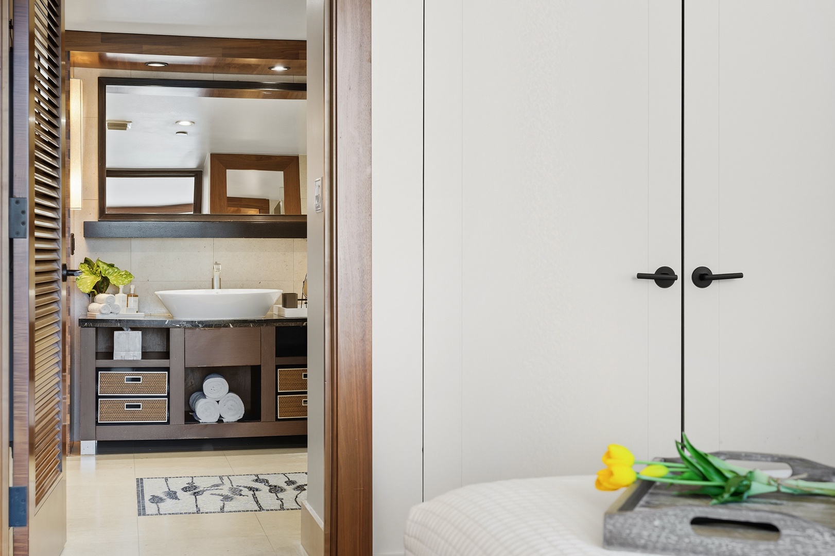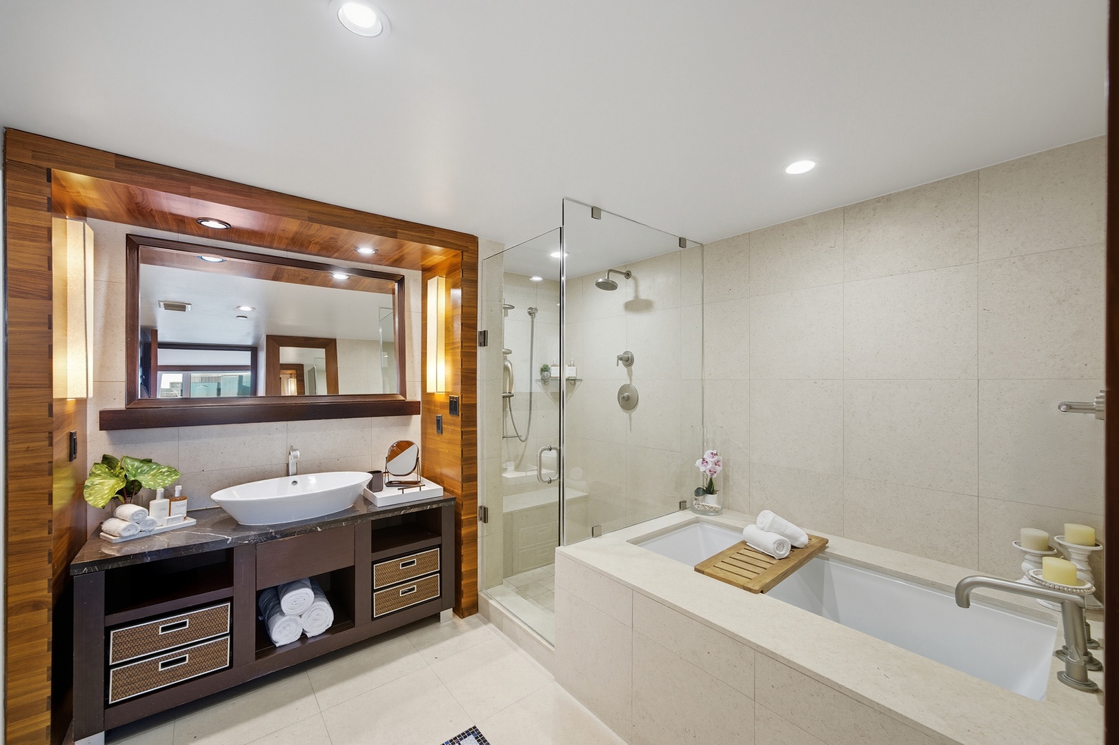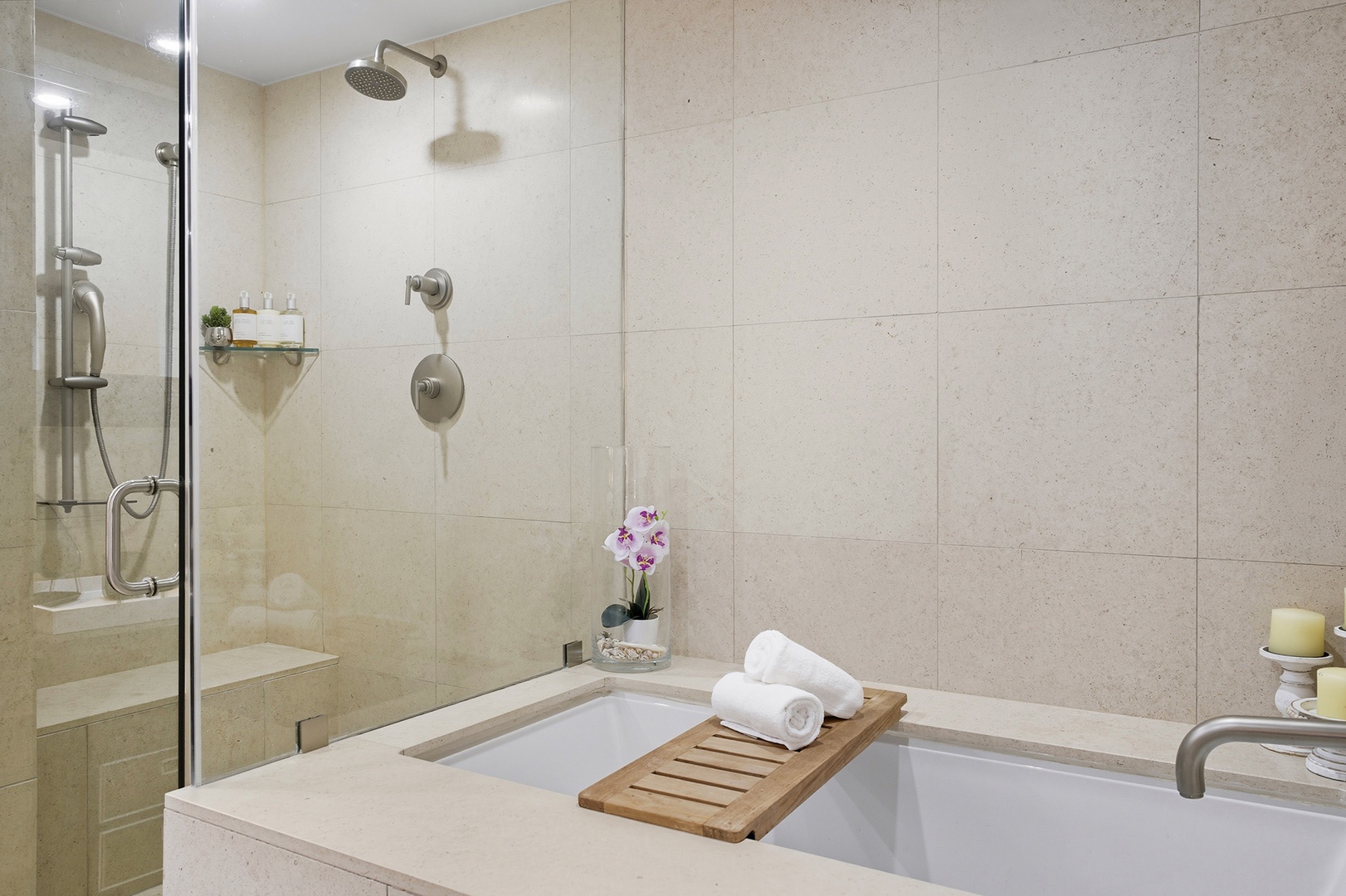 • Bathrooms are fully stocked with premium hotel room amenities and toiletries.