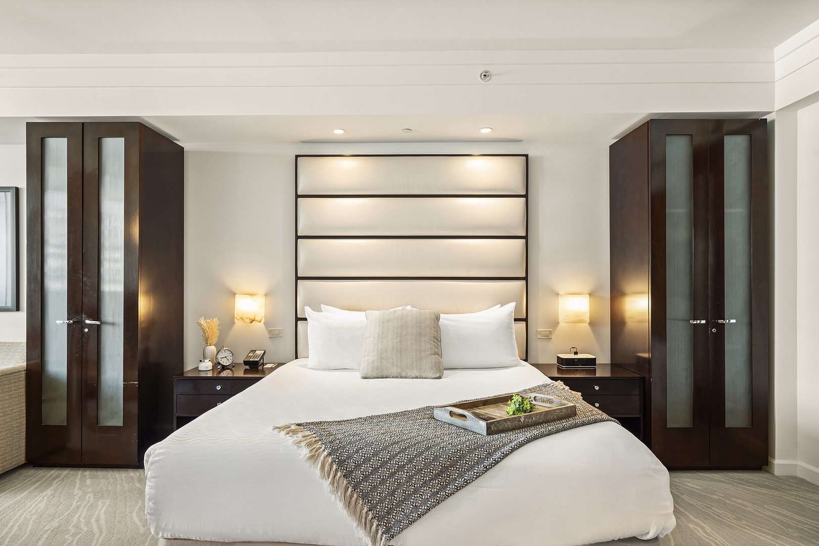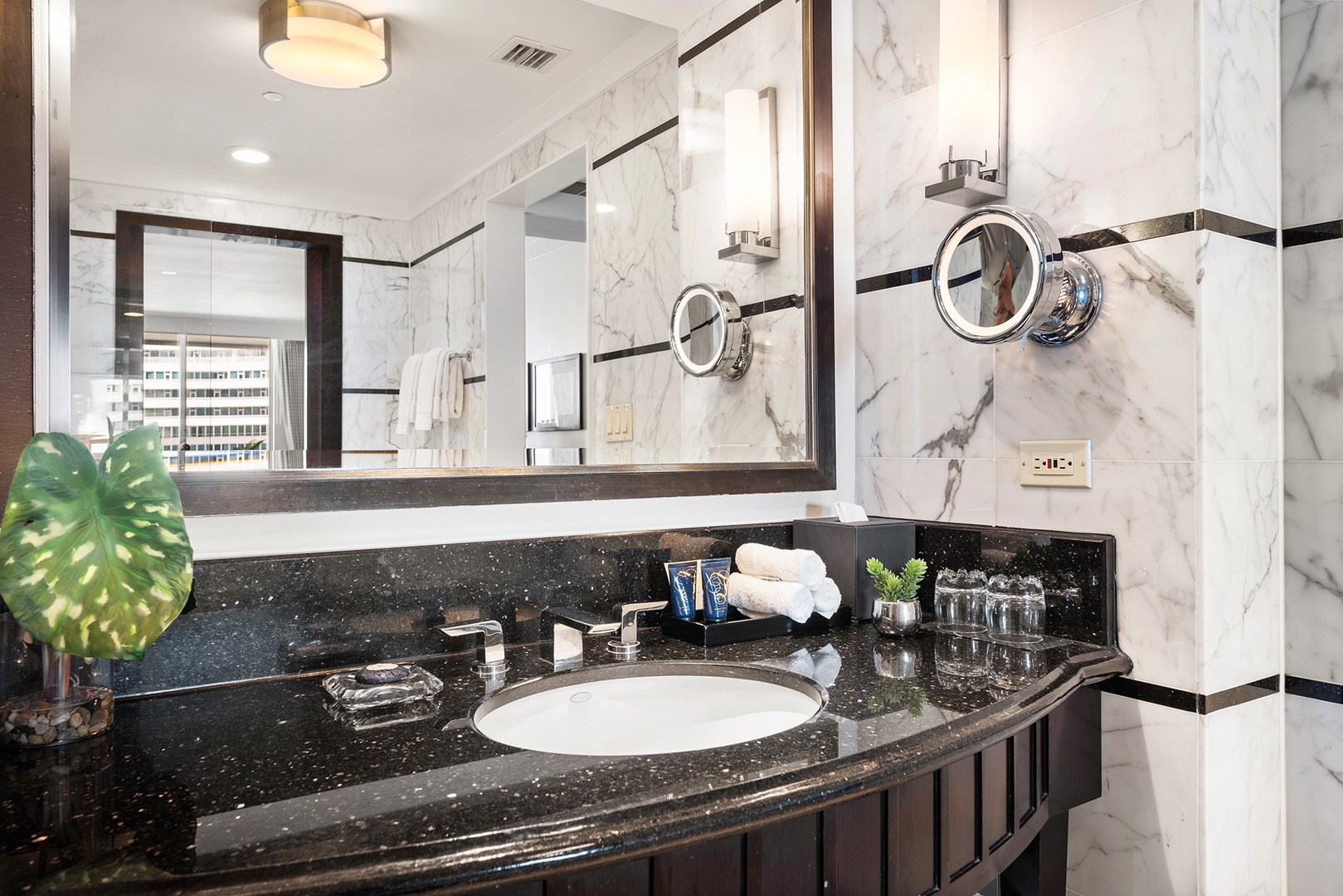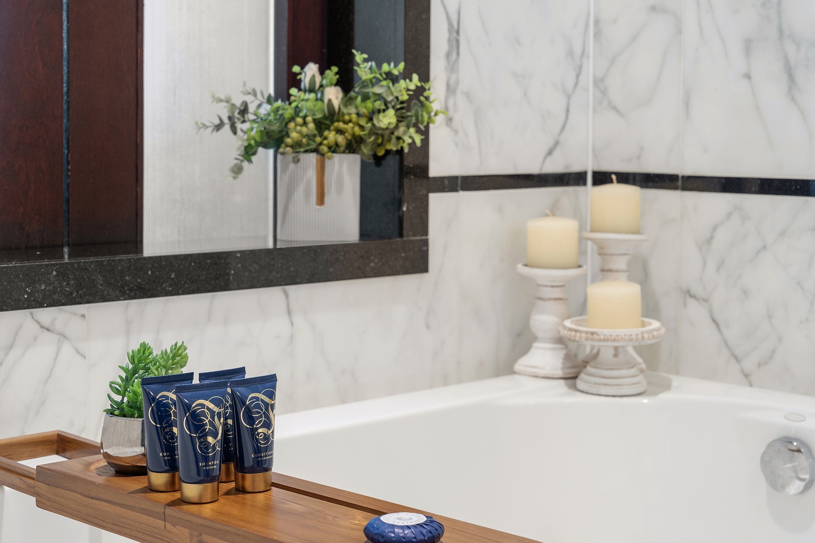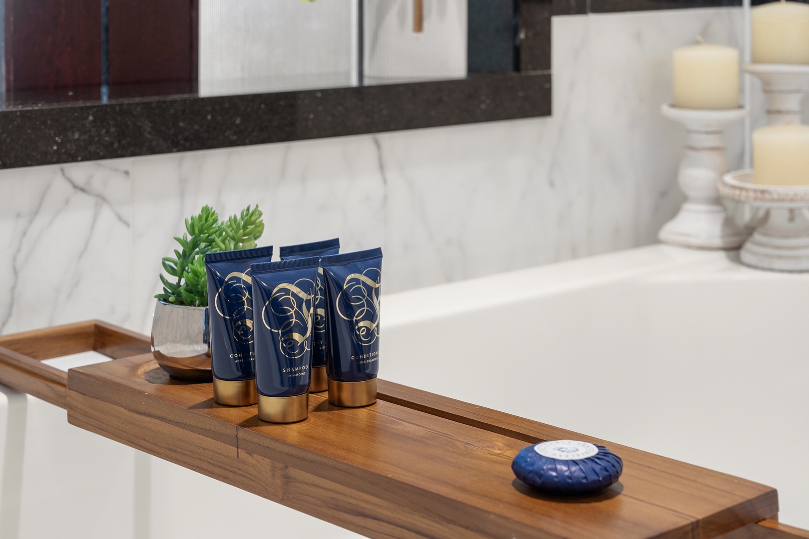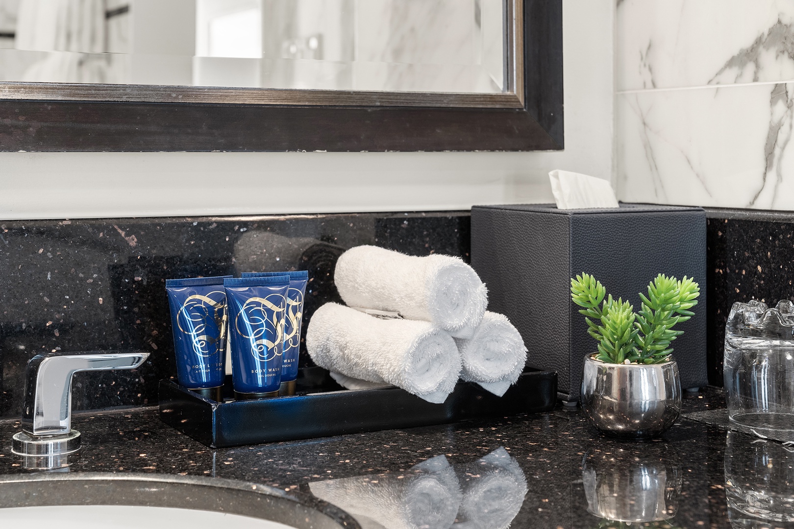 • Bathrooms are fully stocked with premium hotel room amenities and toiletries.