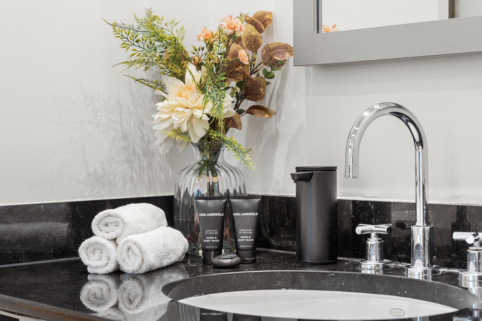 • Bathrooms are fully stocked with premium amenities for your personal needs.