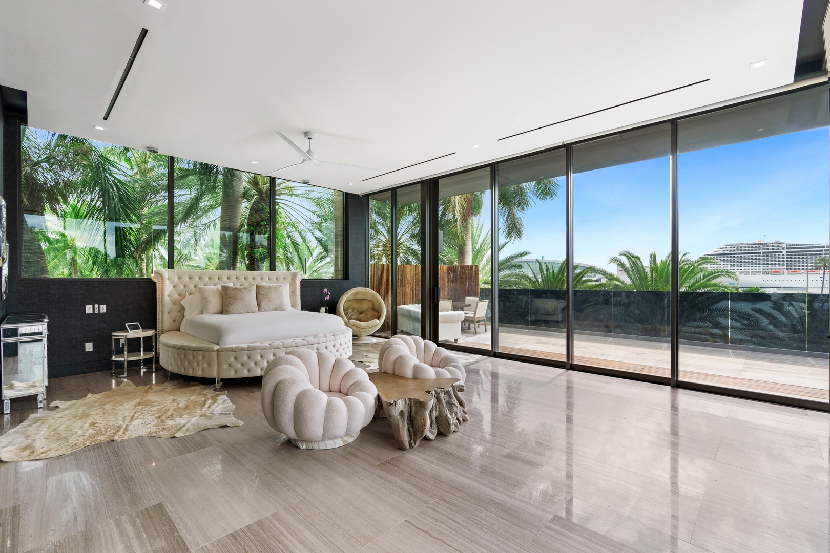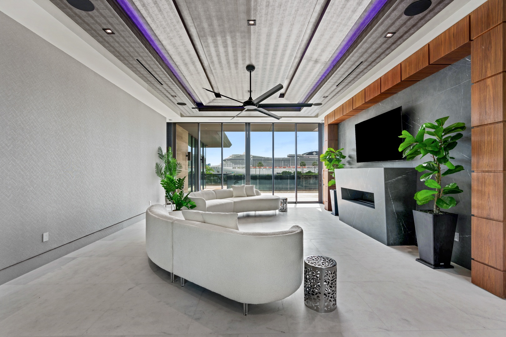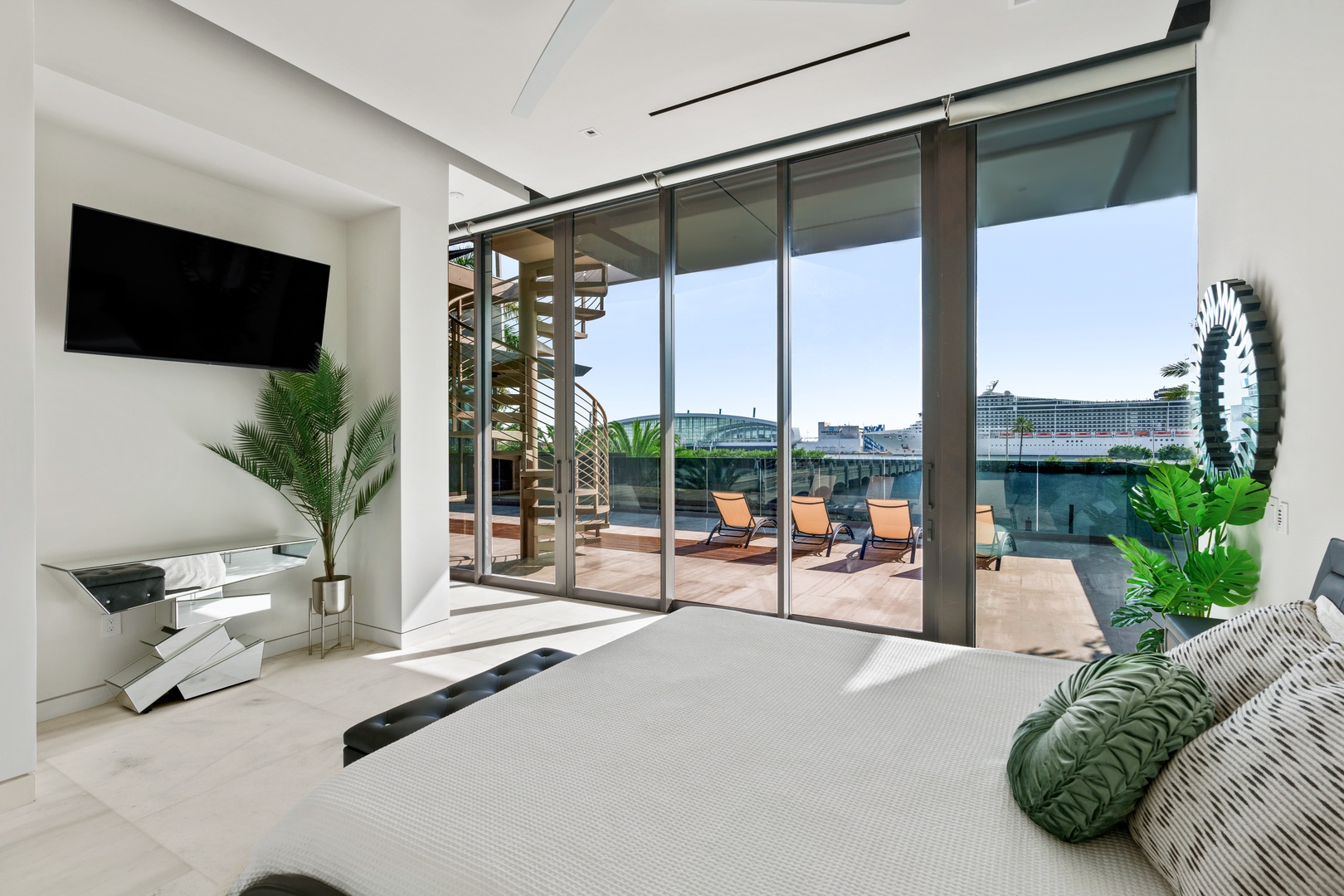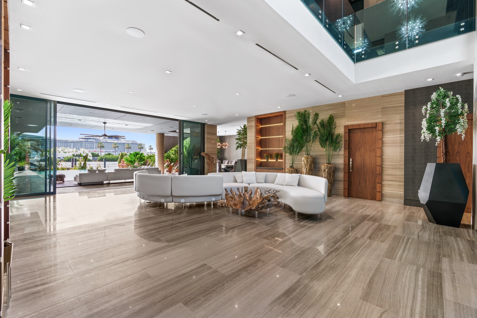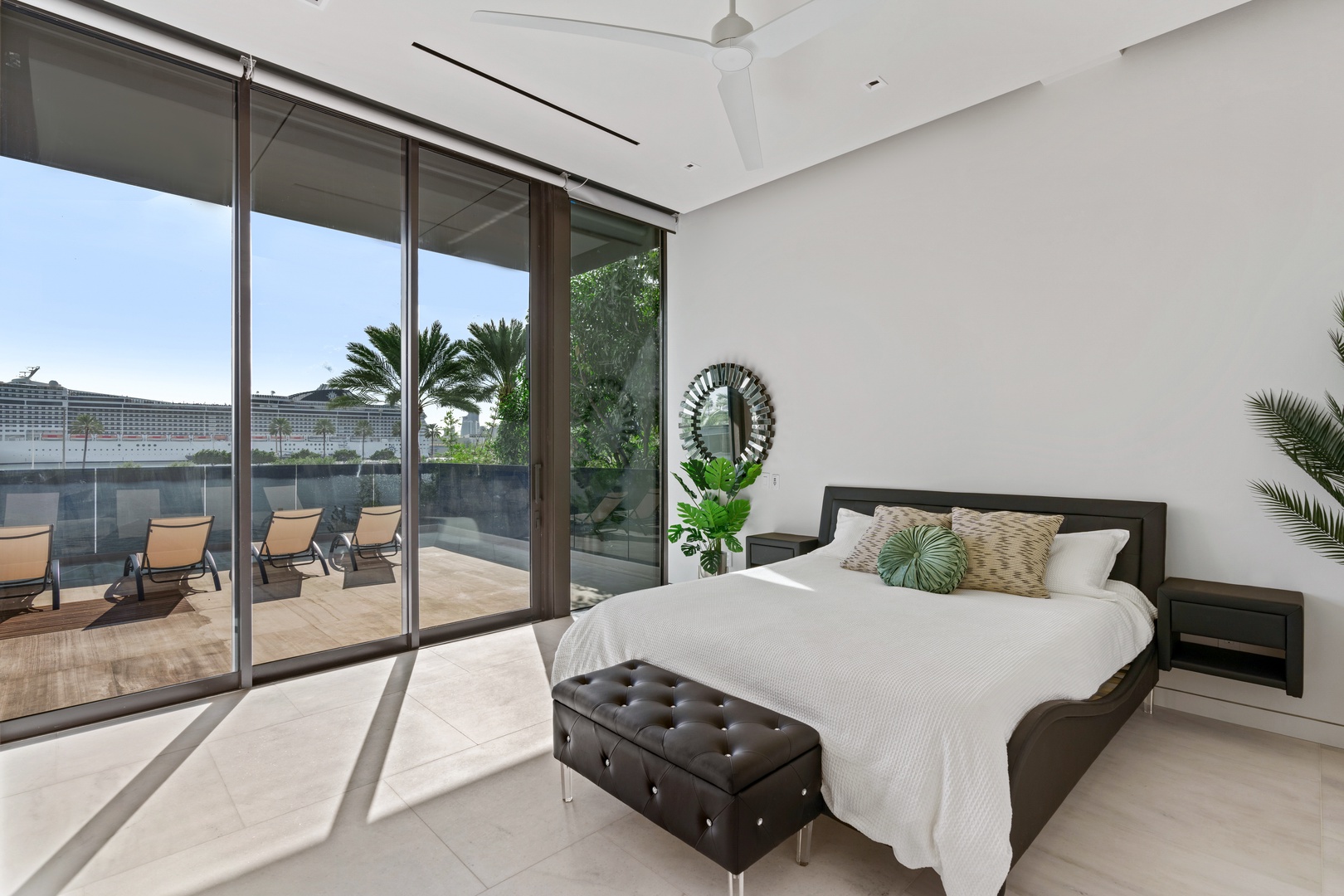 A sixty-foot great room features an airy ambiance, with chic interiors. Stir up a cocktail at either the first or second-story bar while relaxing on plush sofas as you gaze at the cruise ships coming and going through the canal. Or even head to the office to catch up on work.