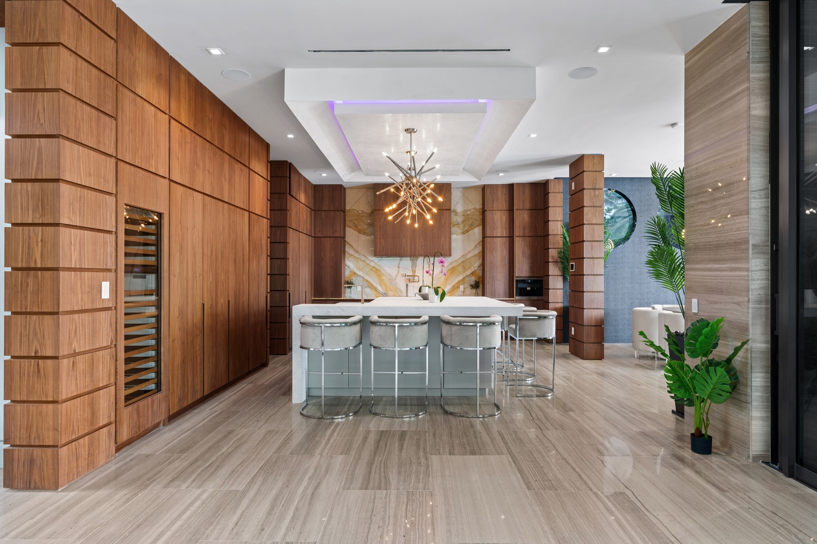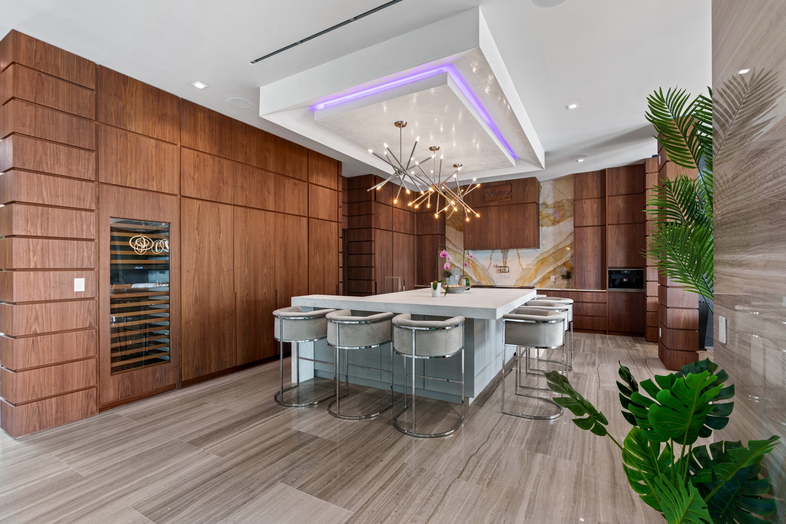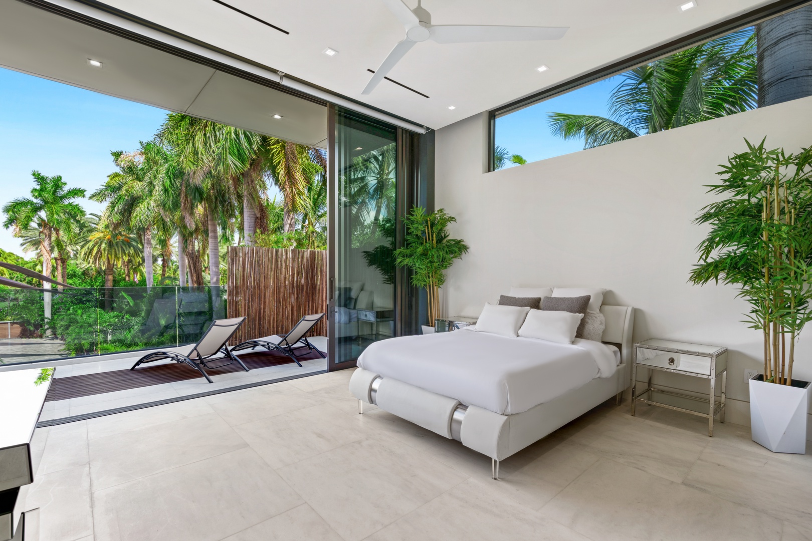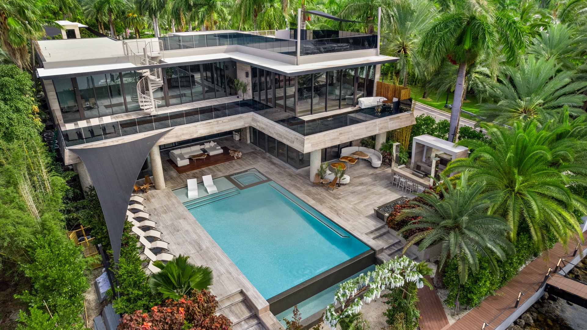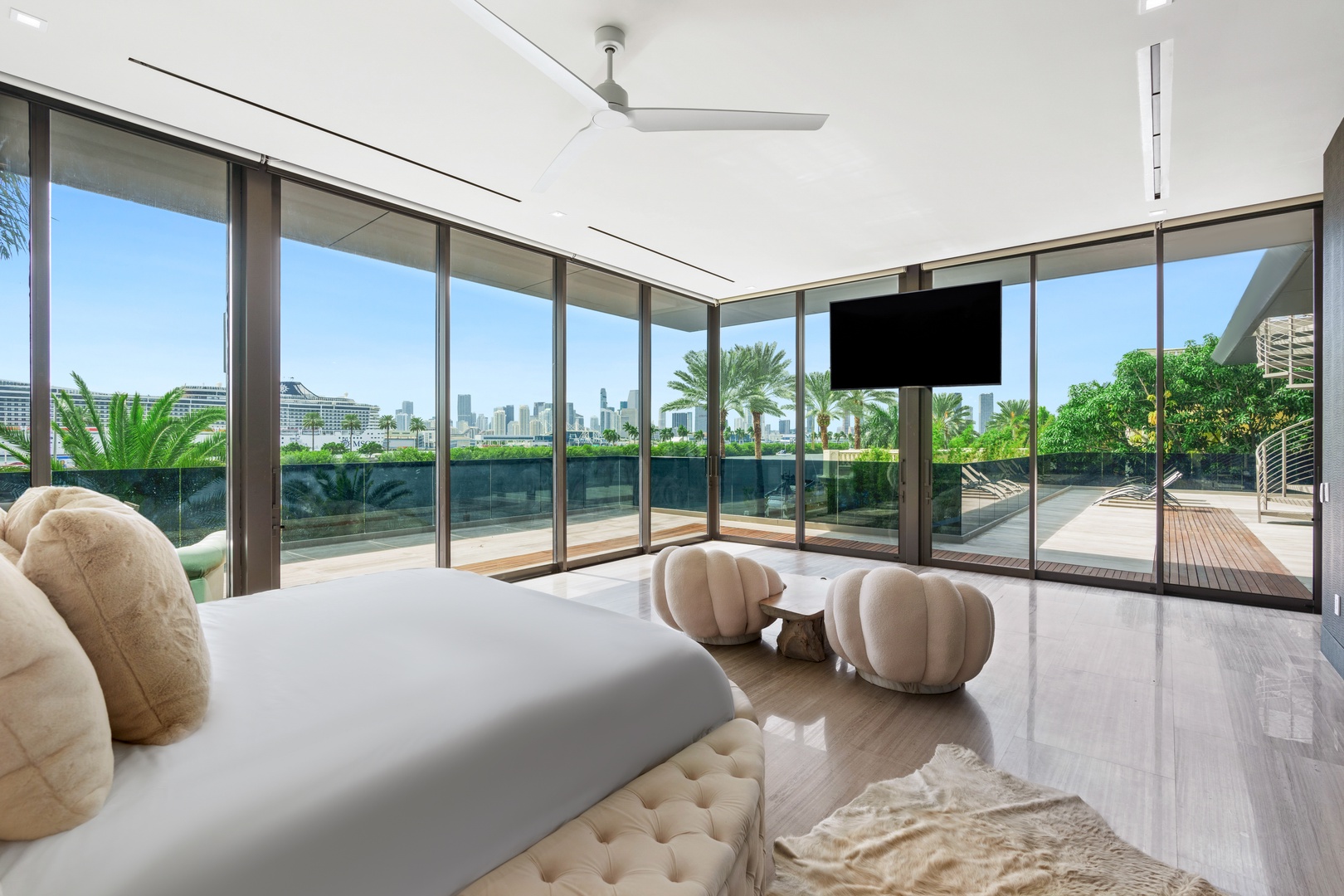 A sixty-foot great room features an airy ambiance, with chic interiors. Stir up a cocktail at either the first or second-story bar while relaxing on plush sofas as you gaze at the cruise ships coming and going through the canal. Or even head to the office to catch up on work.