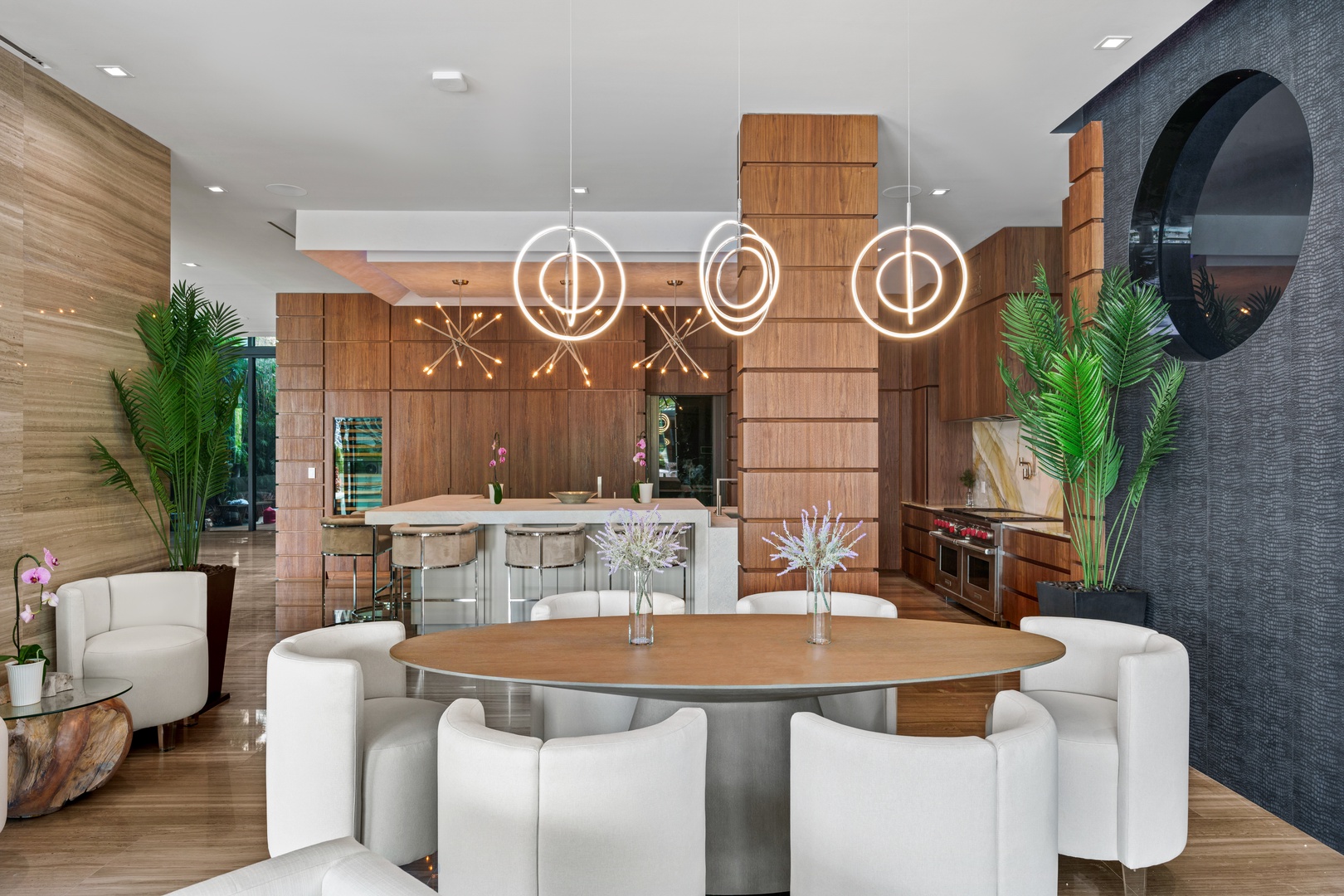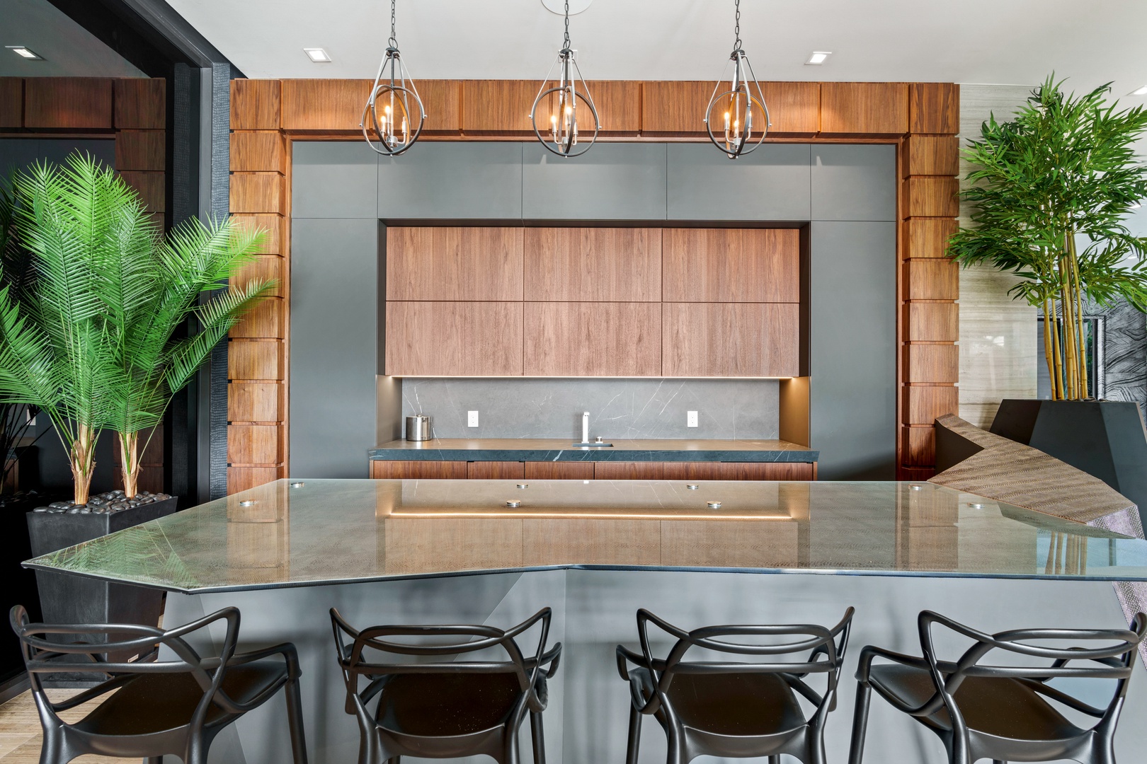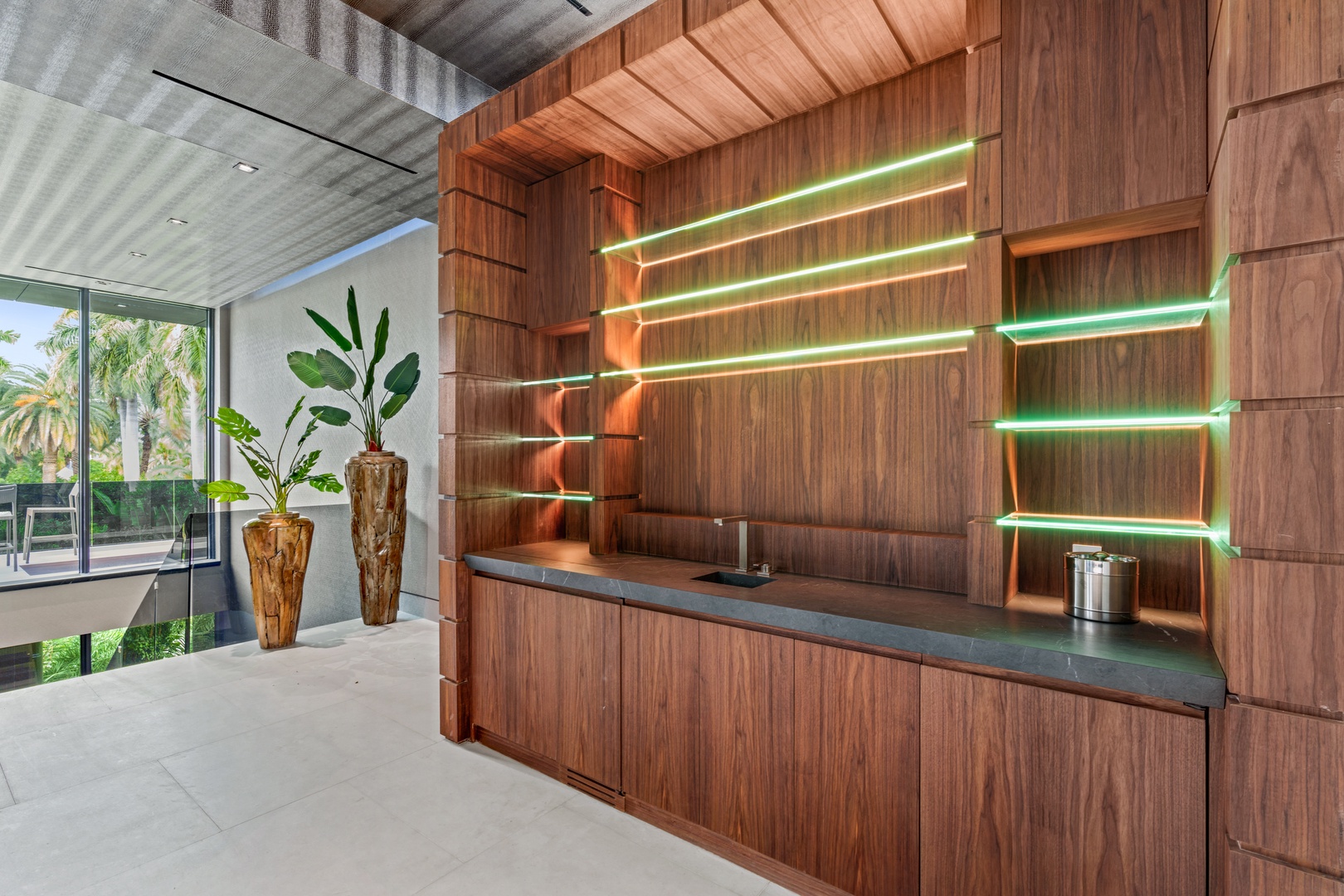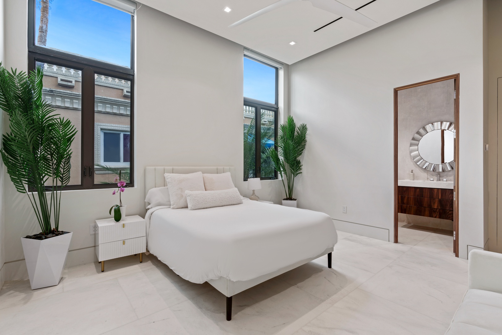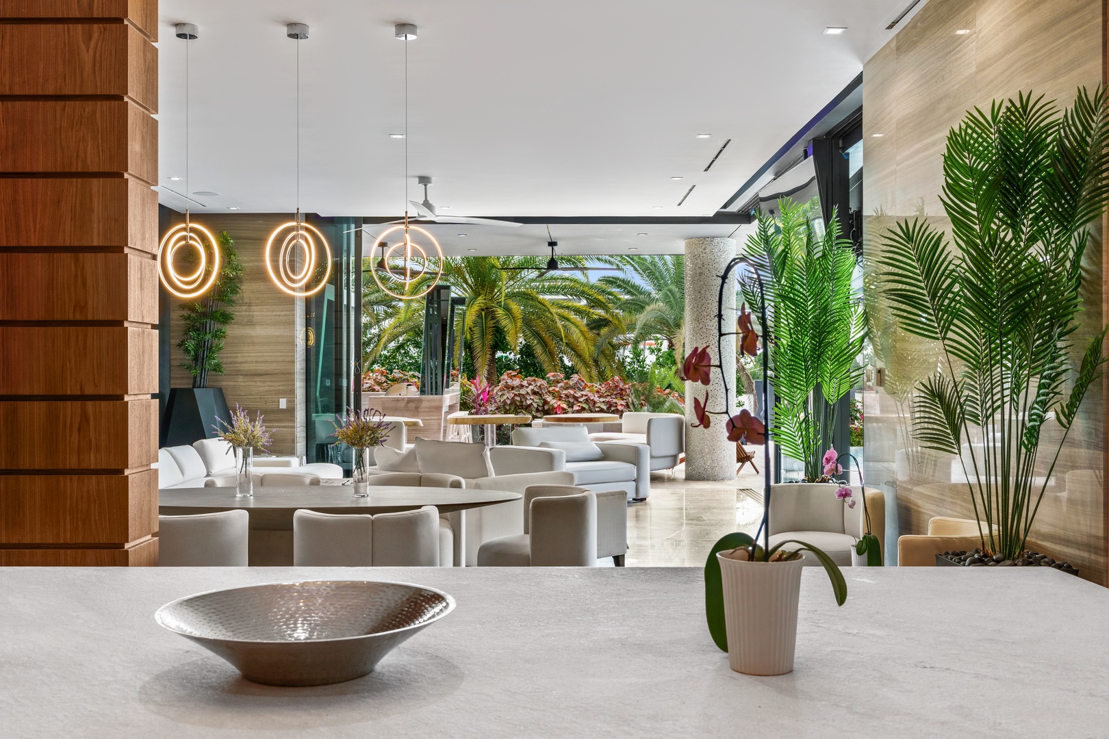 A sixty-foot great room features an airy ambiance, with chic interiors. Stir up a cocktail at either the first or second-story bar while relaxing on plush sofas as you gaze at the cruise ships coming and going through the canal. Or even head to the office to catch up on work.