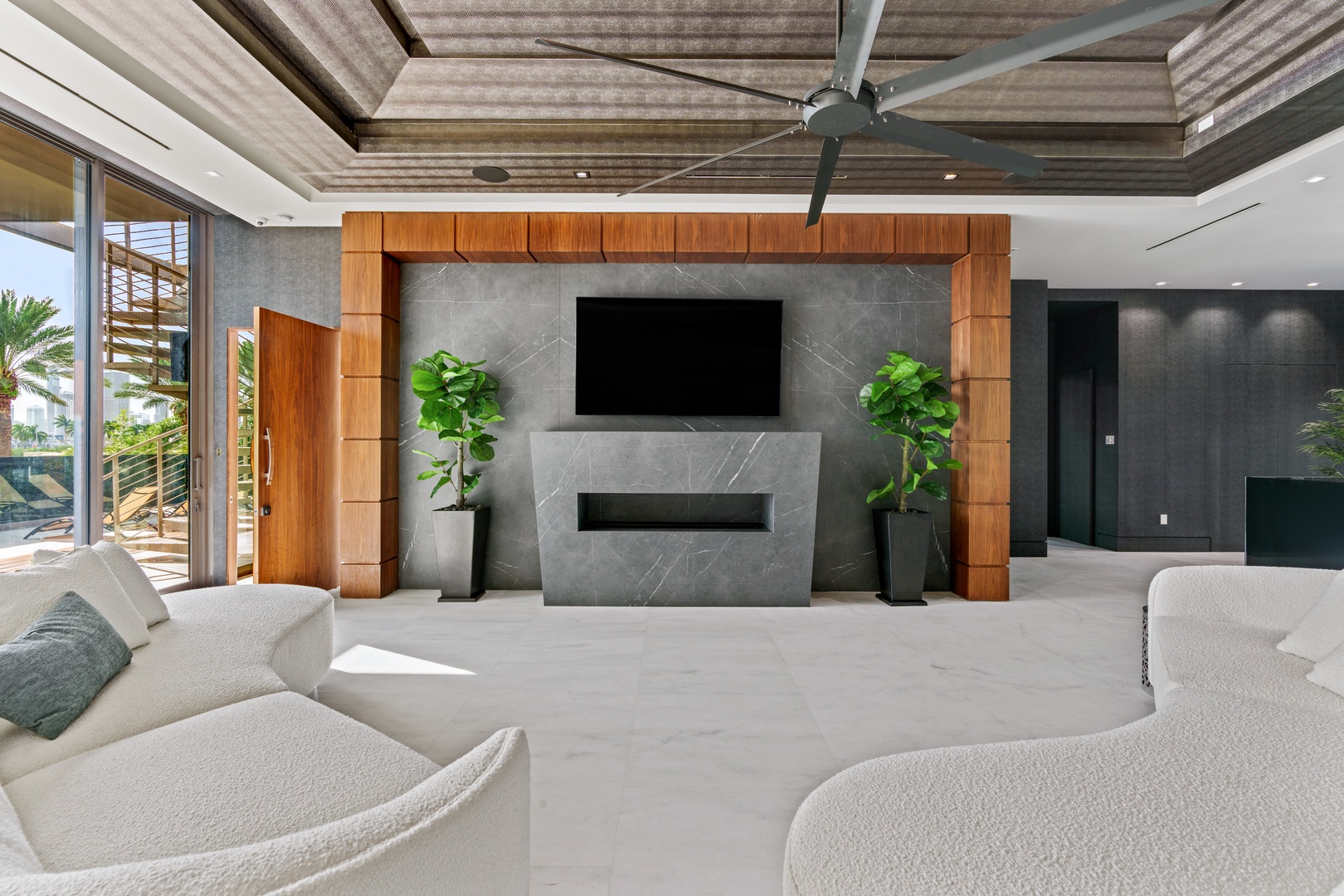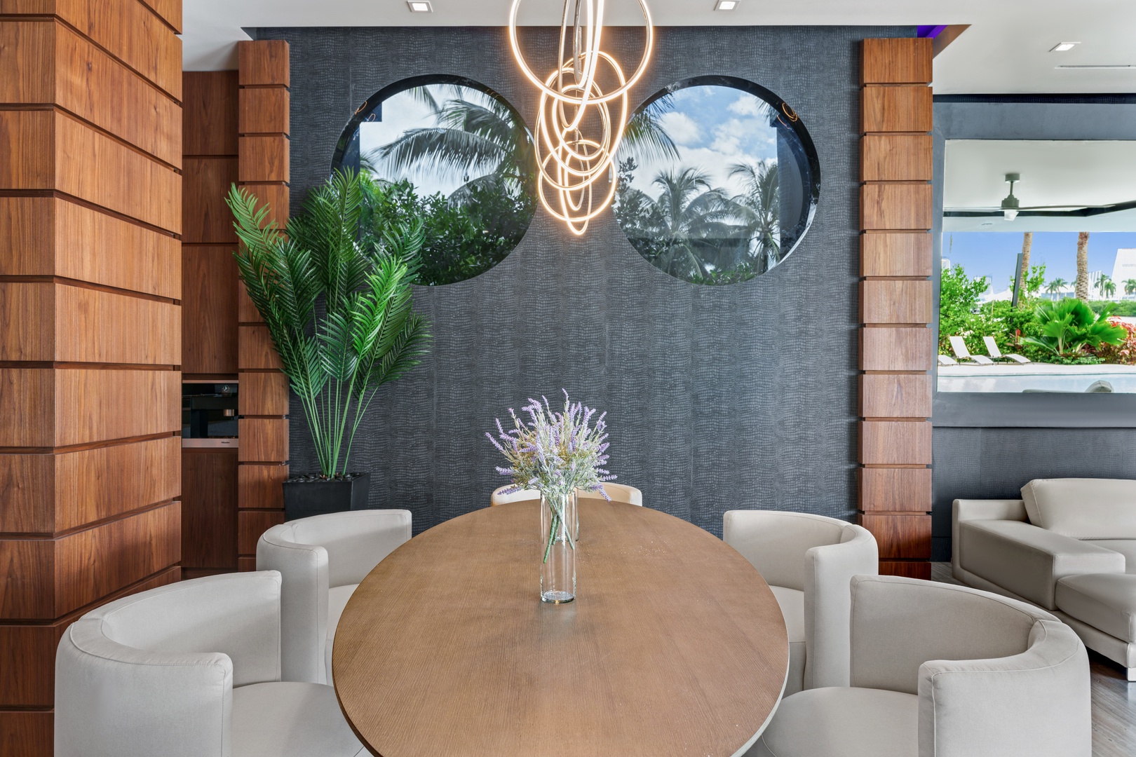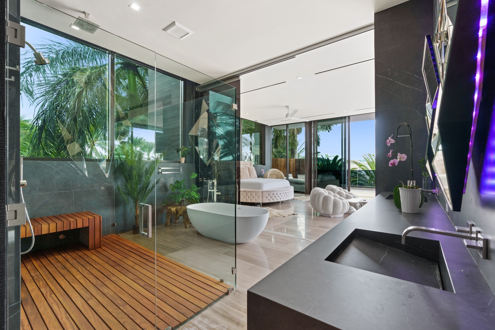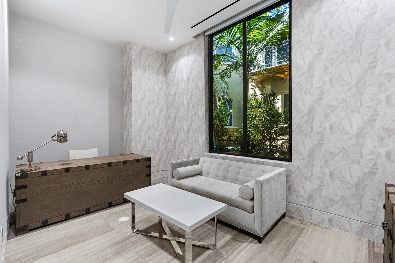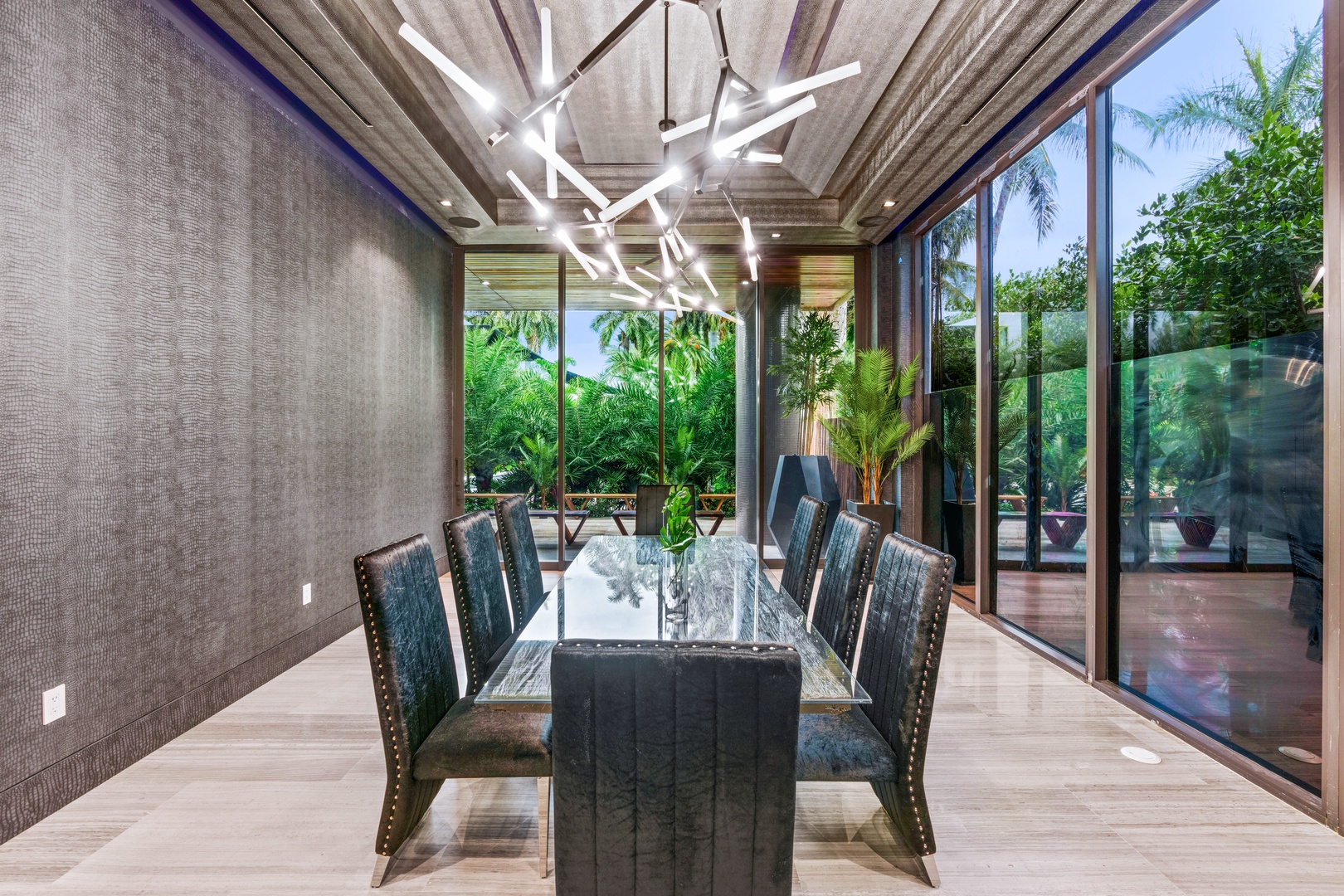 A sixty-foot great room features an airy ambiance, with chic interiors. Stir up a cocktail at either the first or second-story bar while relaxing on plush sofas as you gaze at the cruise ships coming and going through the canal. Or even head to the office to catch up on work.