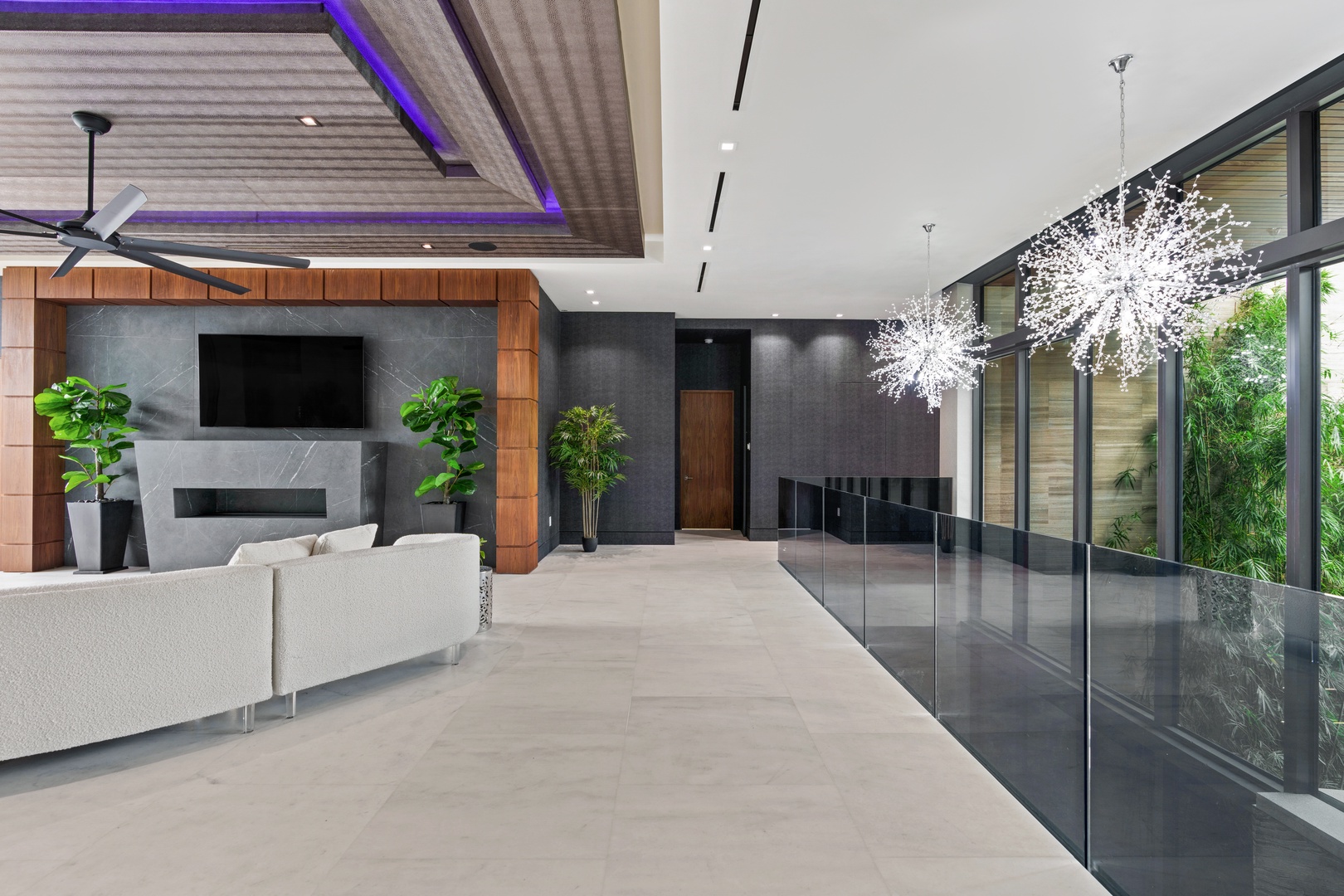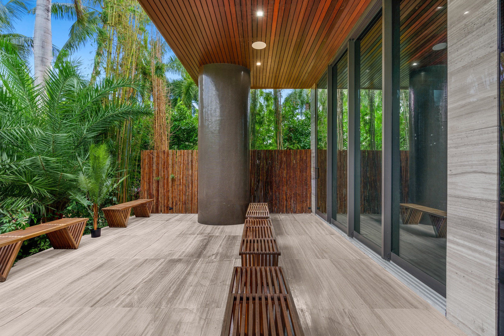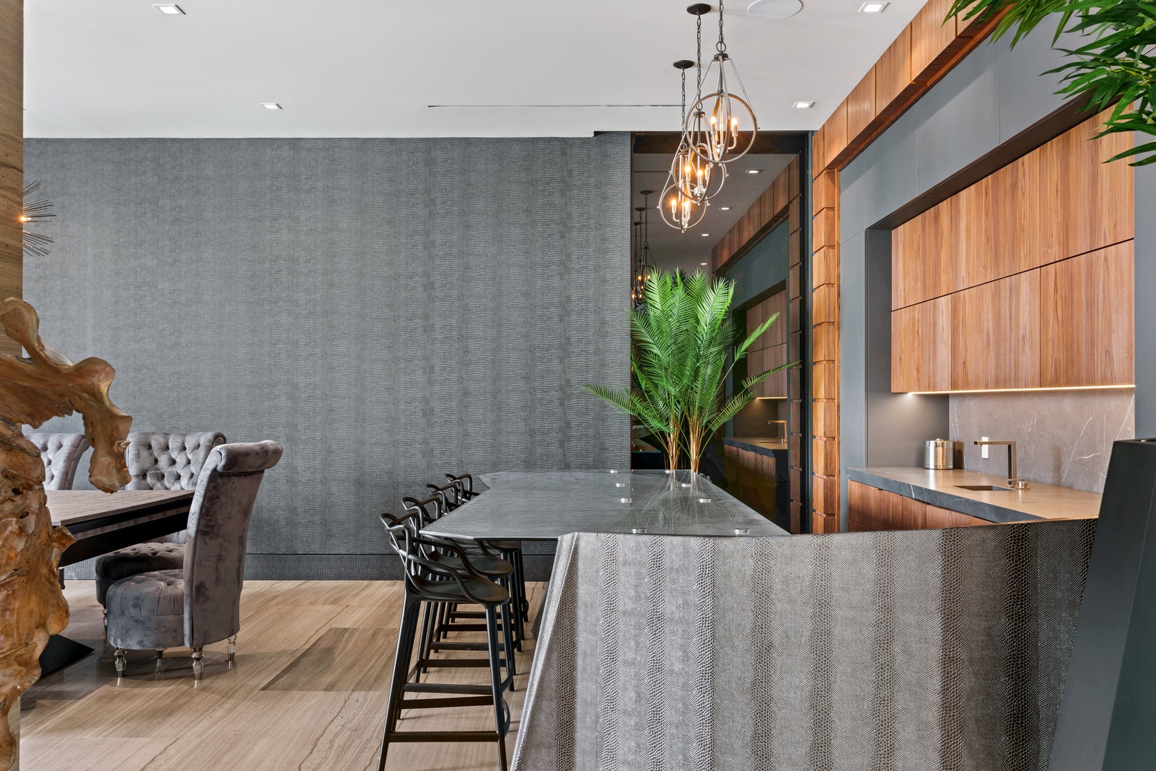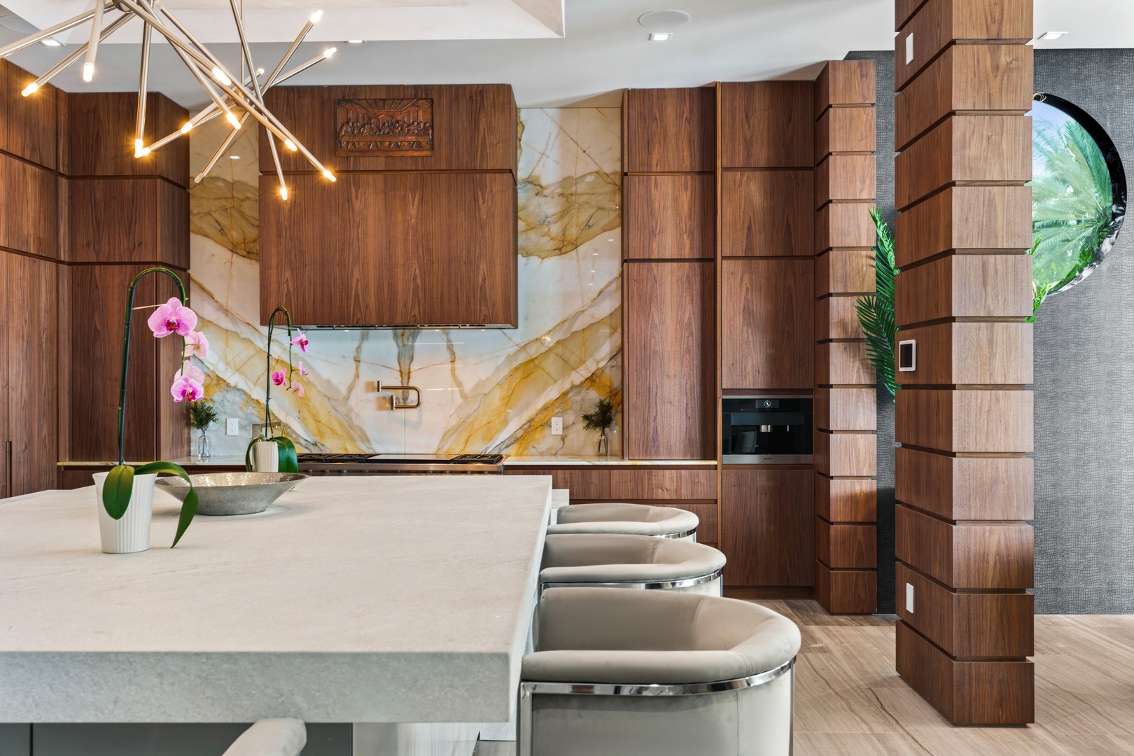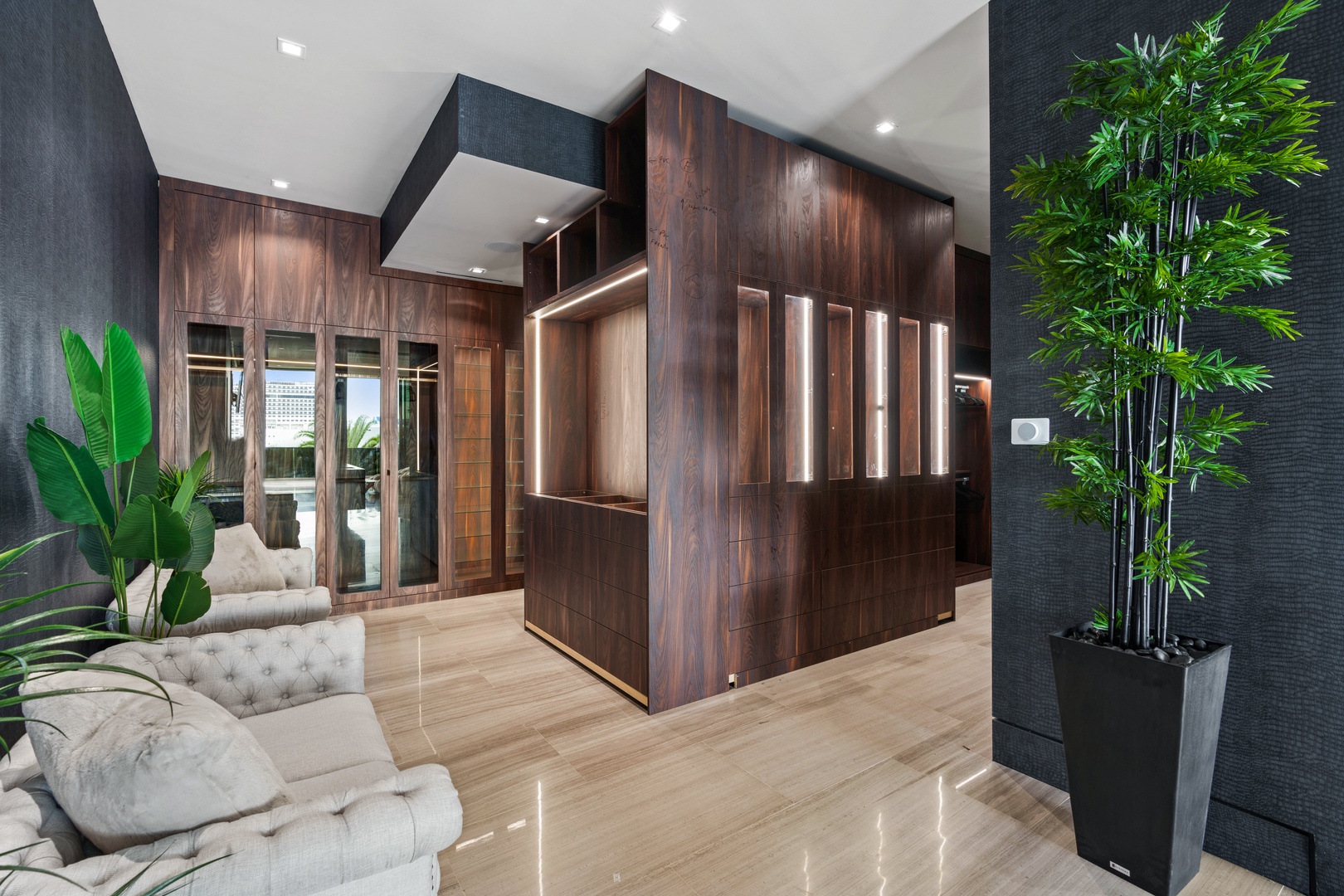 A sixty-foot great room features an airy ambiance, with chic interiors. Stir up a cocktail at either the first or second-story bar while relaxing on plush sofas as you gaze at the cruise ships coming and going through the canal. Or even head to the office to catch up on work.