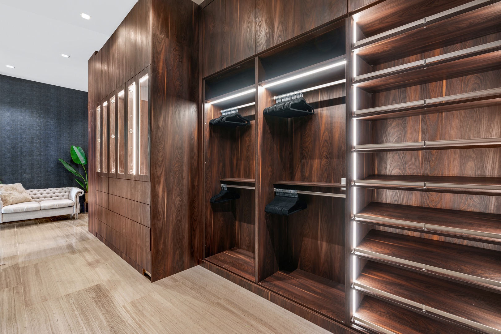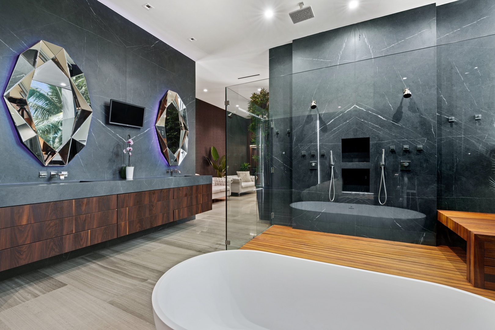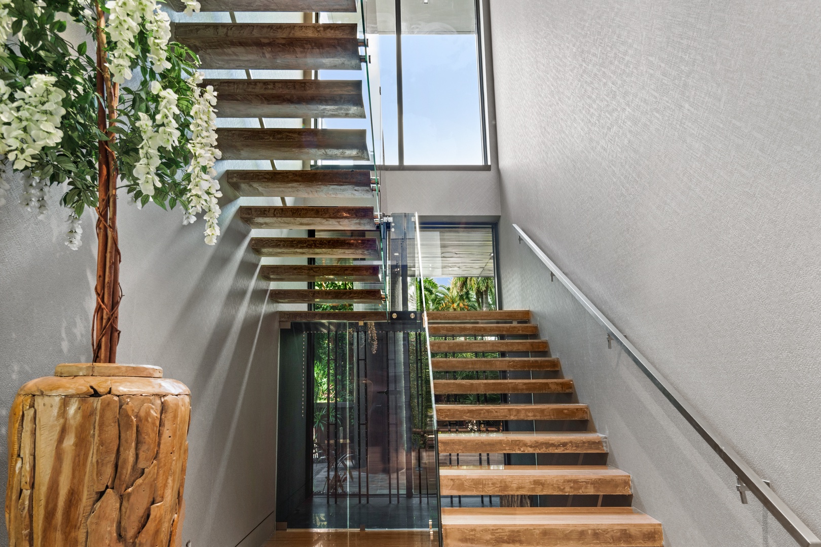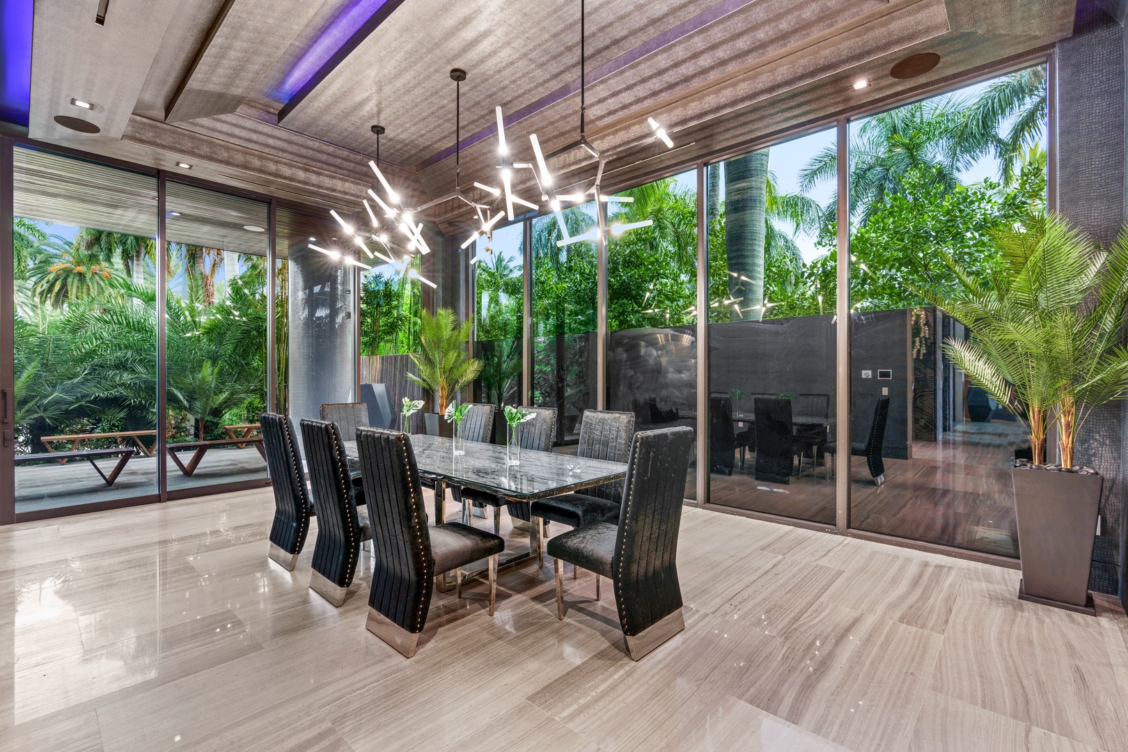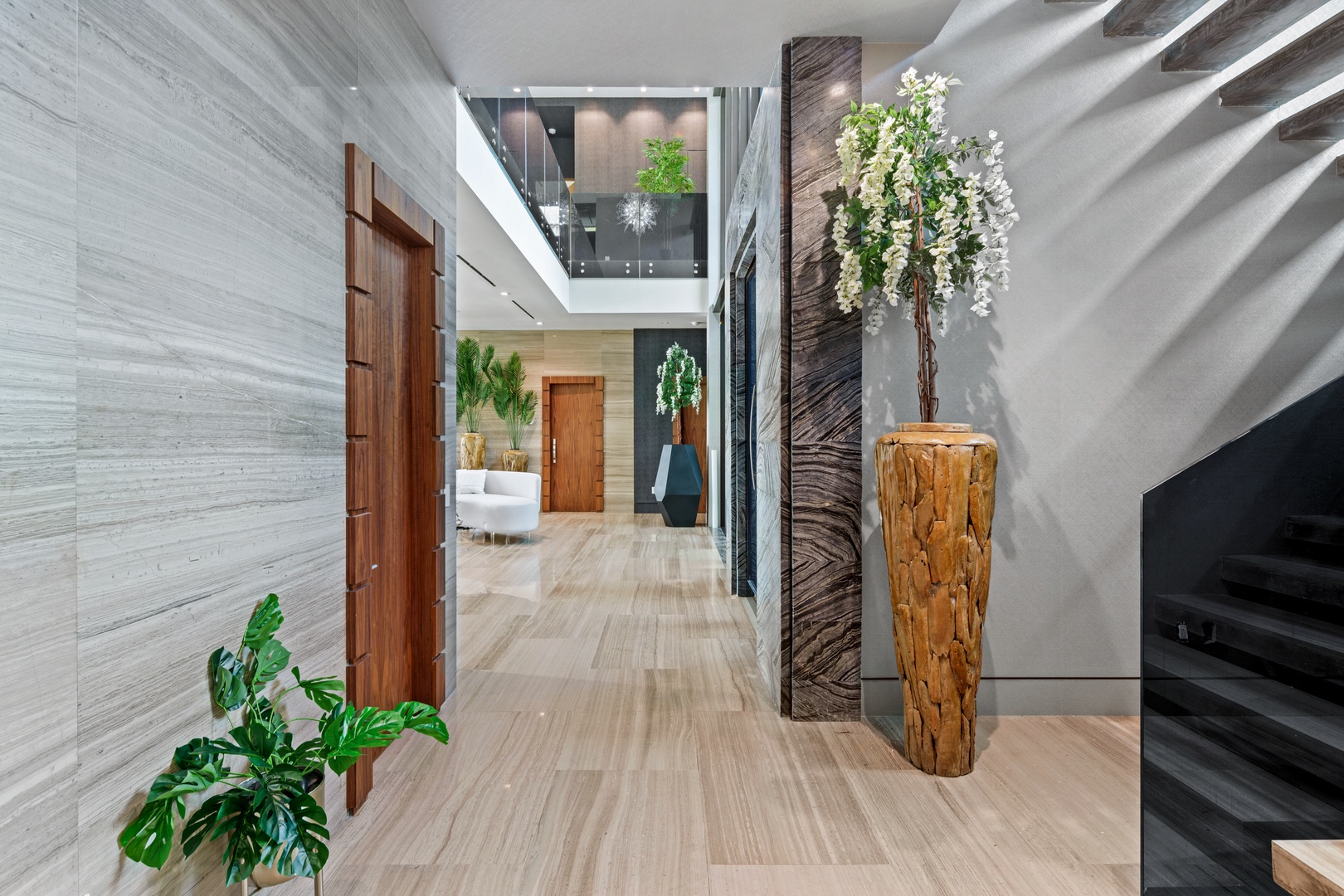 A sixty-foot great room features an airy ambiance, with chic interiors. Stir up a cocktail at either the first or second-story bar while relaxing on plush sofas as you gaze at the cruise ships coming and going through the canal. Or even head to the office to catch up on work.