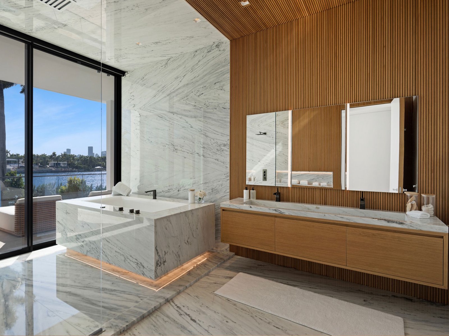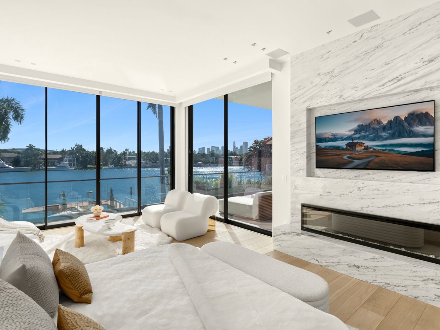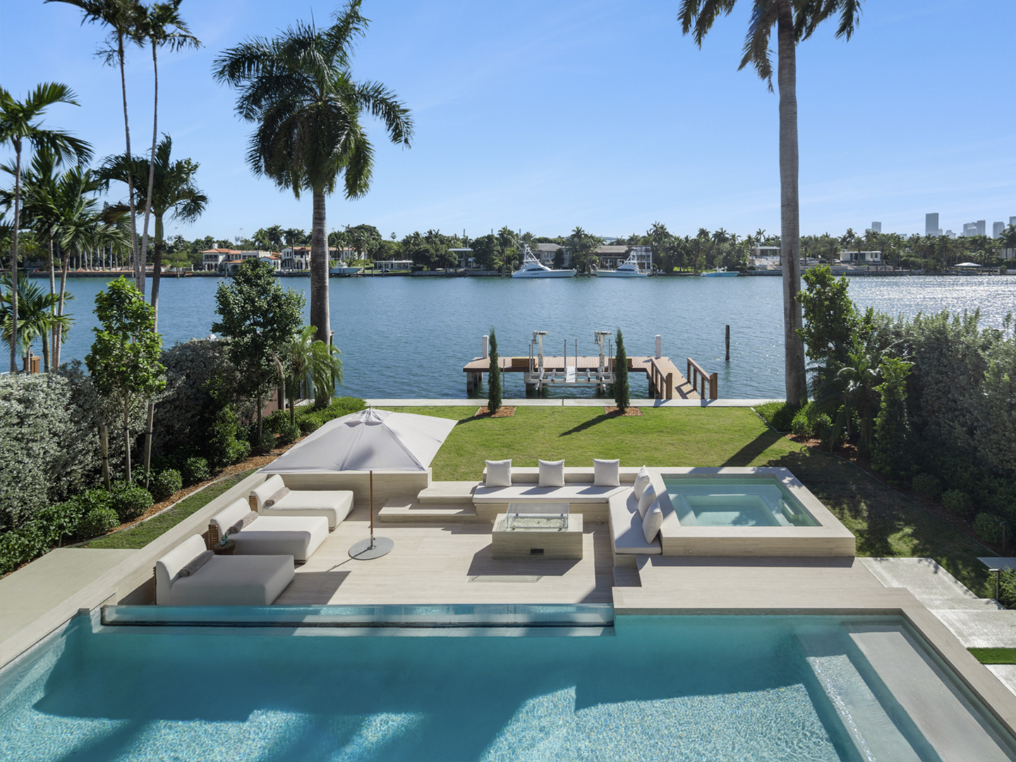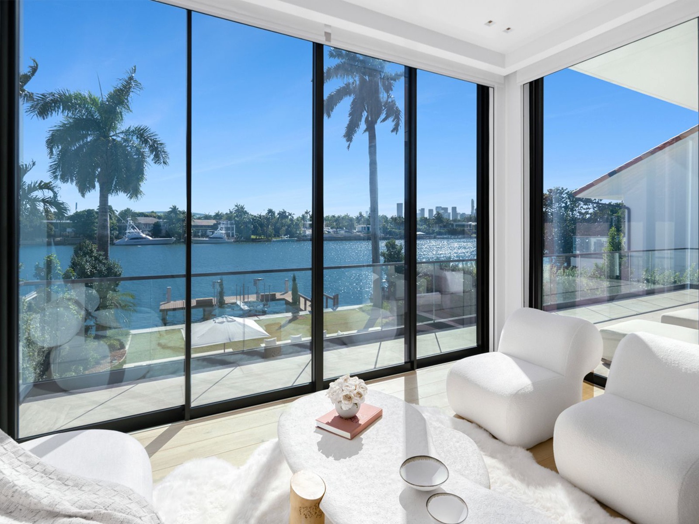 This striking modern residence, set behind the gates of prestigious Hibiscus Island, captivates with exceptional design, refined finishes, and unobstructed views of the downtown skyline. A dramatic 23-foot steel entry door unveils a waterfront salon framed in telescopic glass, where a contemporary fireplace and designer lighting create an atmosphere of sophistication.