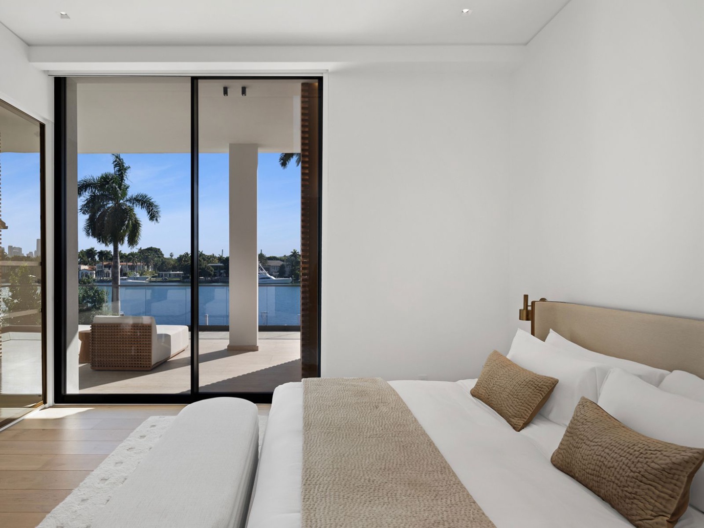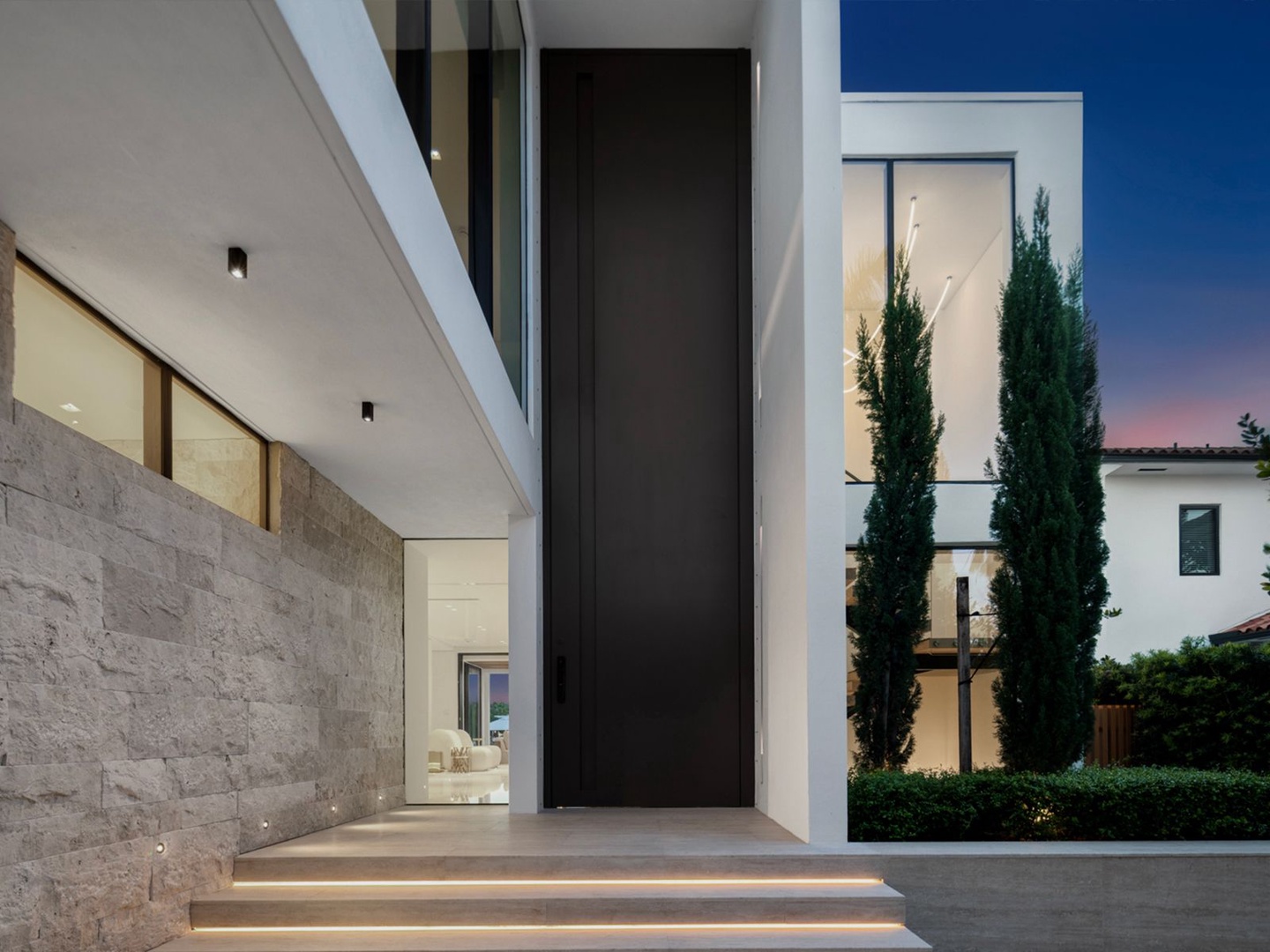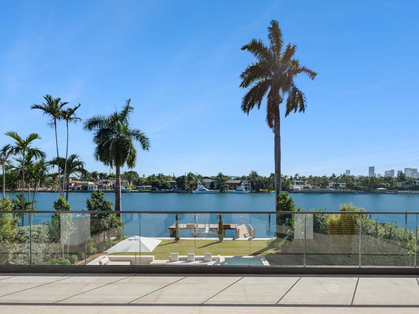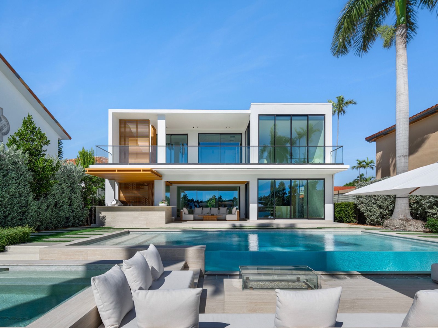 This striking modern residence, set behind the gates of prestigious Hibiscus Island, captivates with exceptional design, refined finishes, and unobstructed views of the downtown skyline. A dramatic 23-foot steel entry door unveils a waterfront salon framed in telescopic glass, where a contemporary fireplace and designer lighting create an atmosphere of sophistication.
