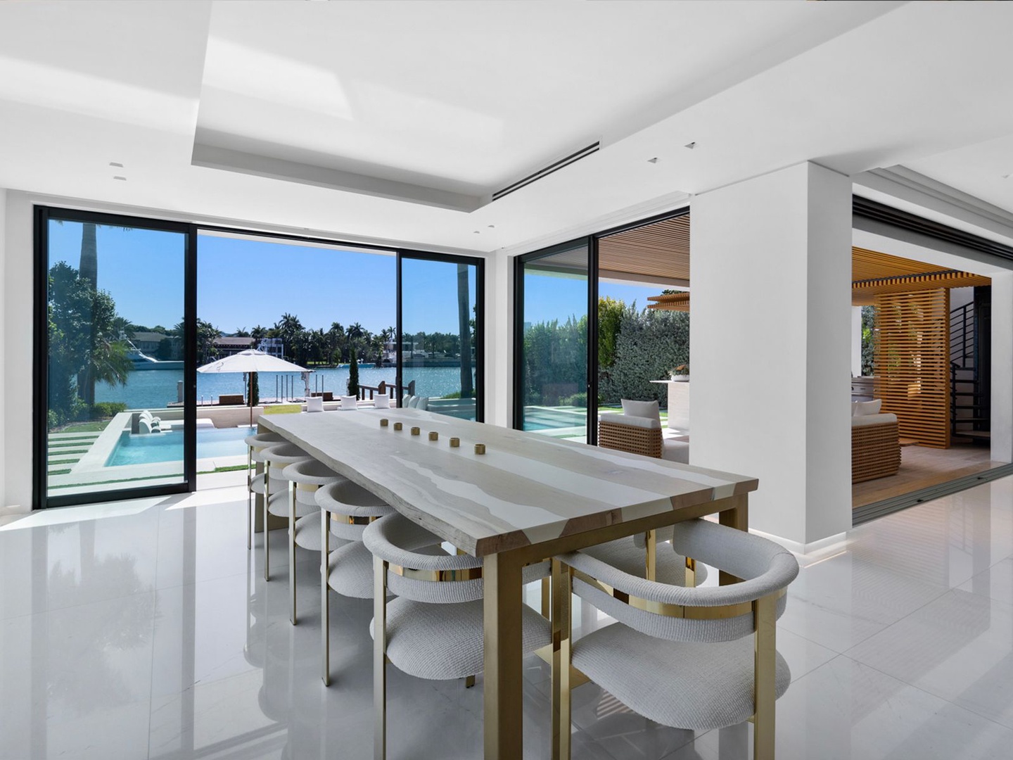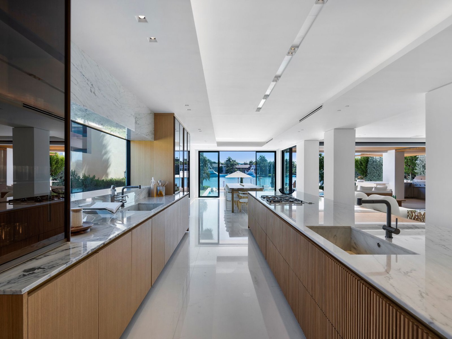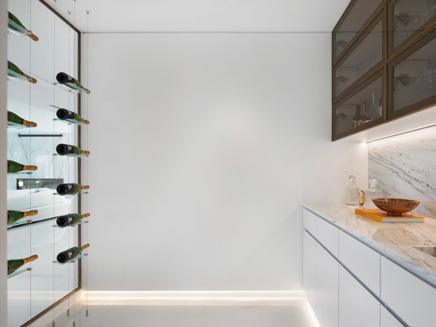 The gourmet kitchen, masterfully appointed with marble surfaces and fluted oak cabinetry, is equipped for both culinary artistry and elegant entertaining—complete with a statement hosting island, glass-enclosed wine wall, and radiant dining area.
