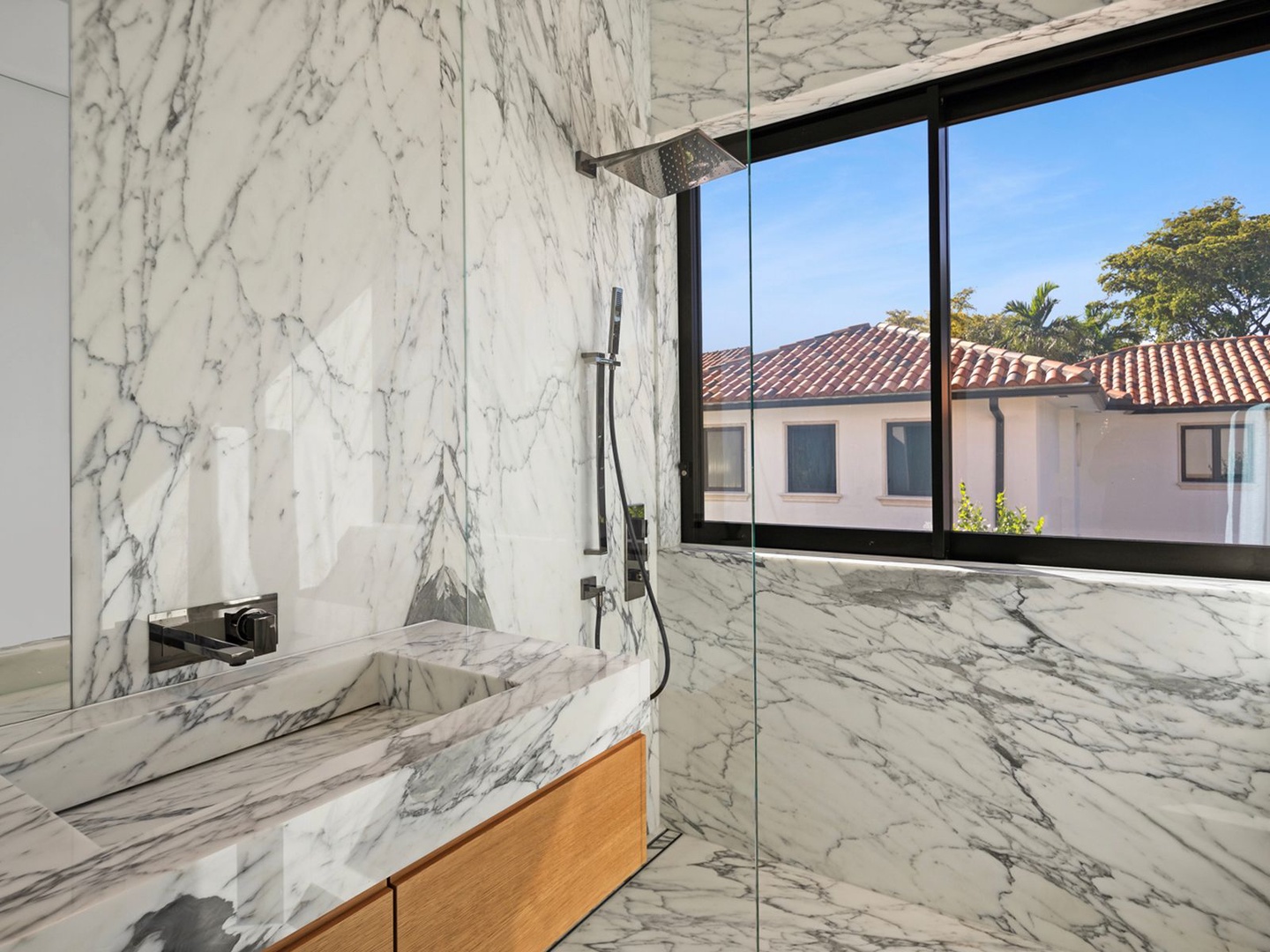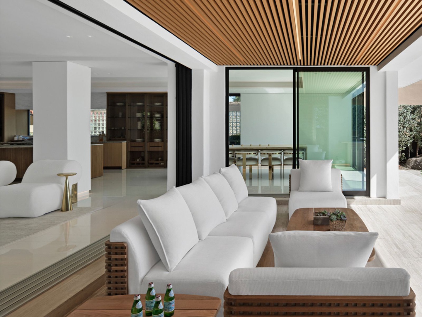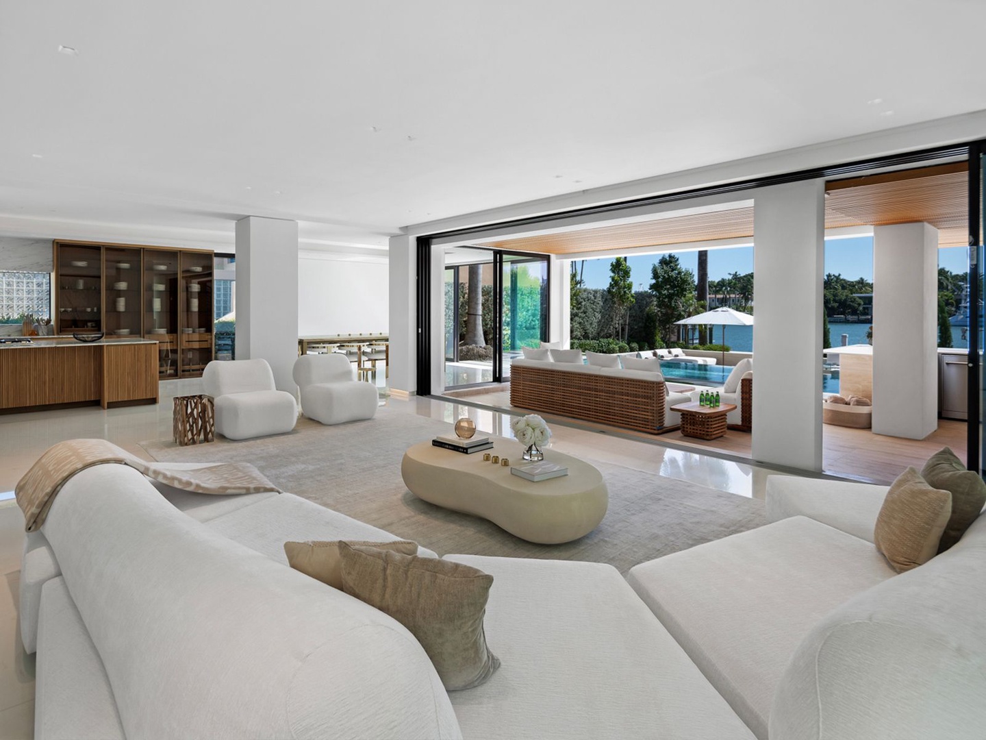The gourmet kitchen, masterfully appointed with marble surfaces and fluted oak cabinetry, is equipped for both culinary artistry and elegant entertaining—complete with a statement hosting island, glass-enclosed wine wall, and radiant dining area.