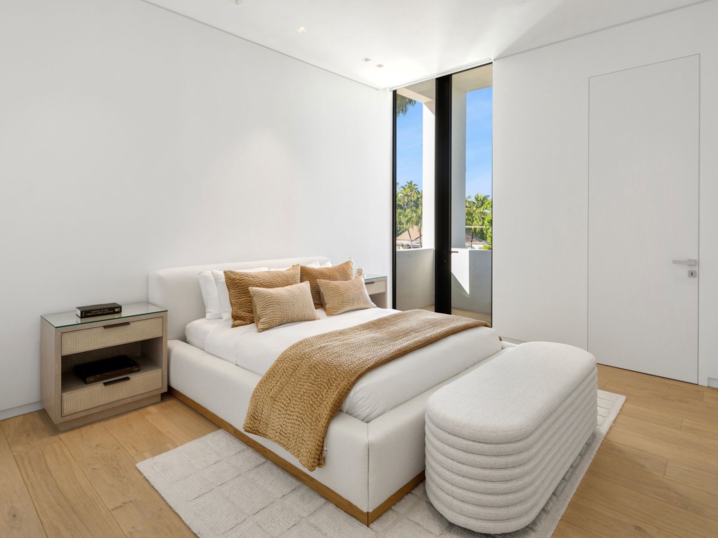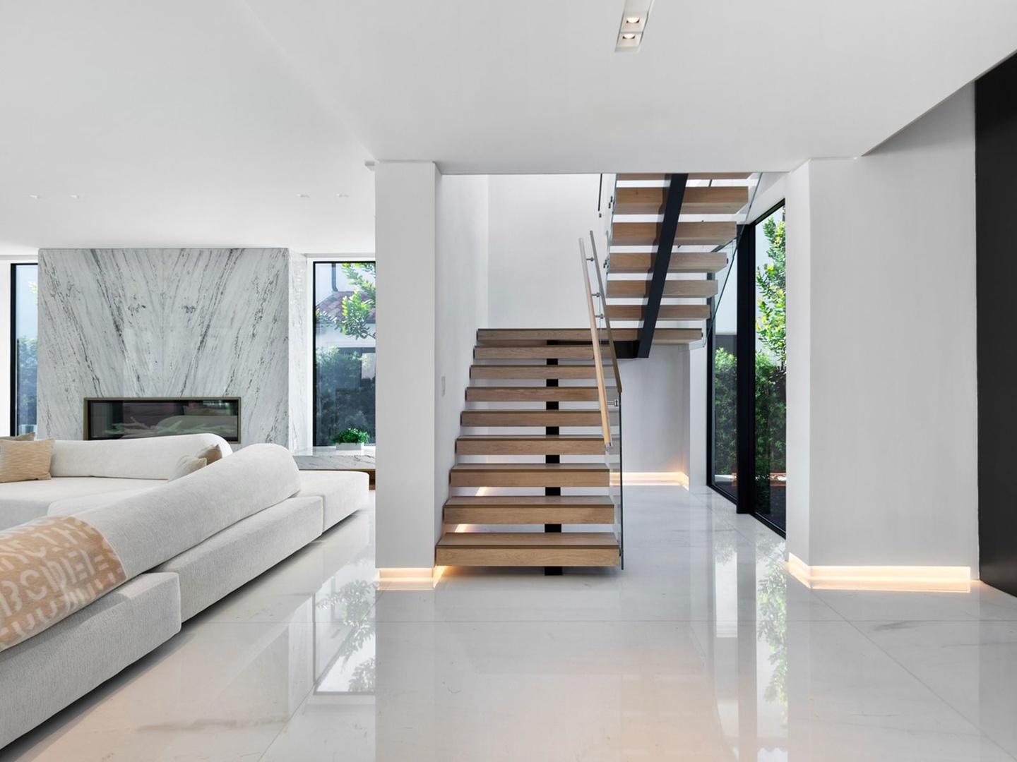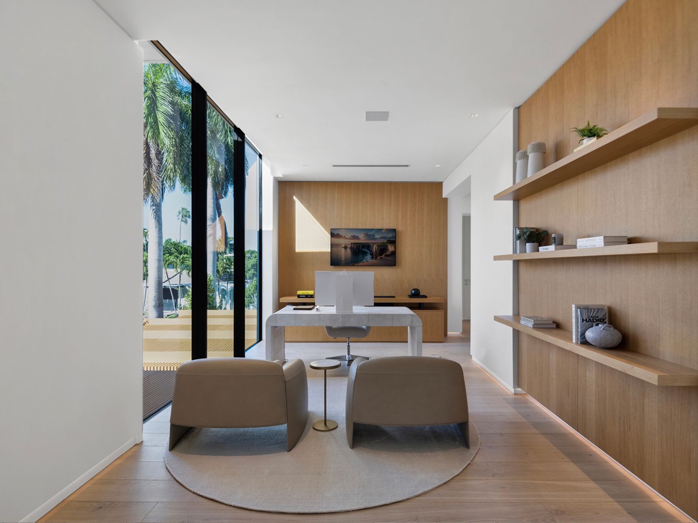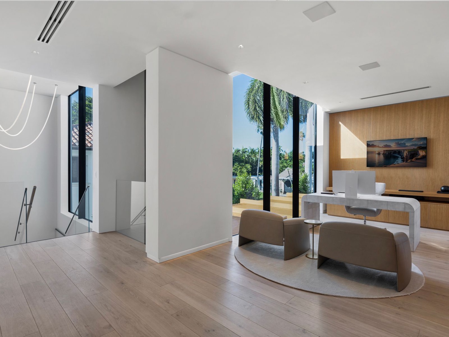 A sculptural floating staircase ascends to an executive office and four impeccably designed ensuite bedrooms, all featuring wide-plank oak flooring. The expansive primary suite is a sanctuary unto itself, offering dual lounge areas, a grand custom dressing room, a midnight bar, and a spa-style marble bath that opens to a private terrace with panoramic city views.