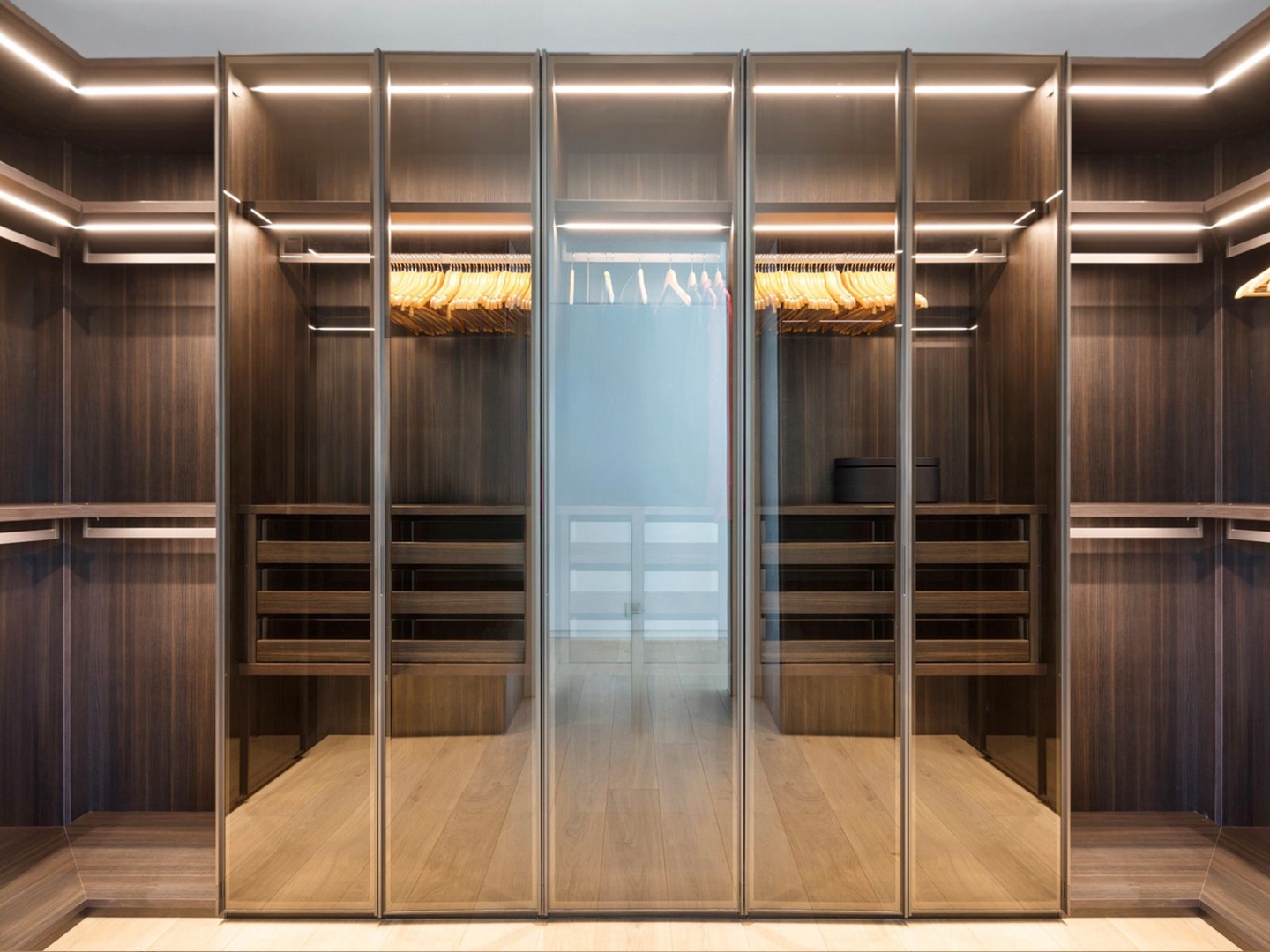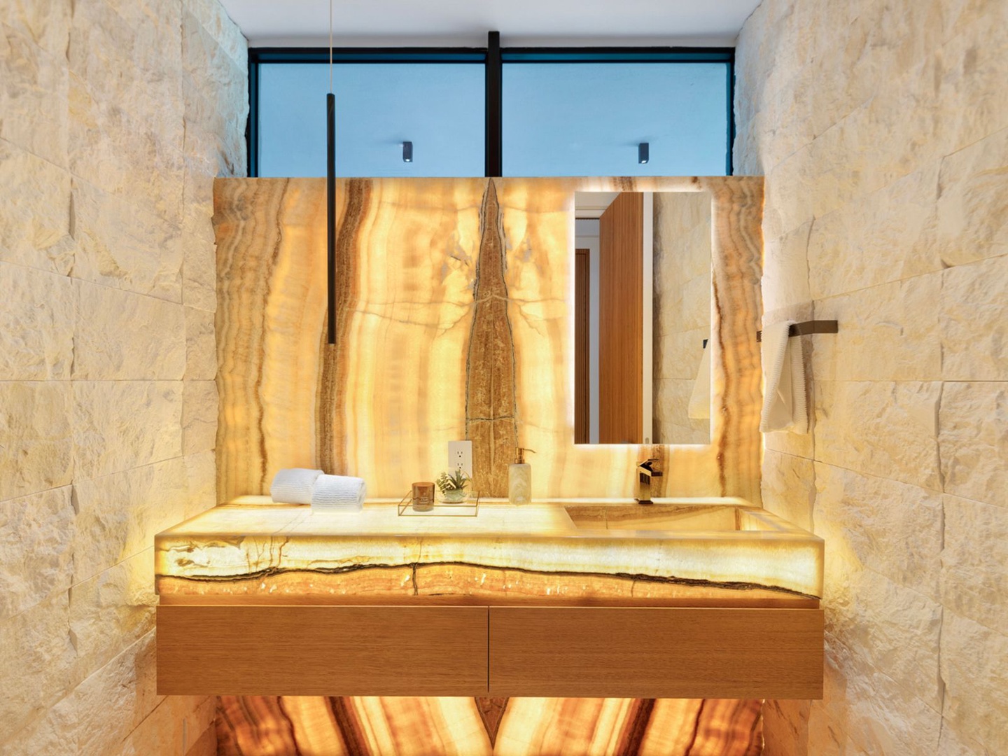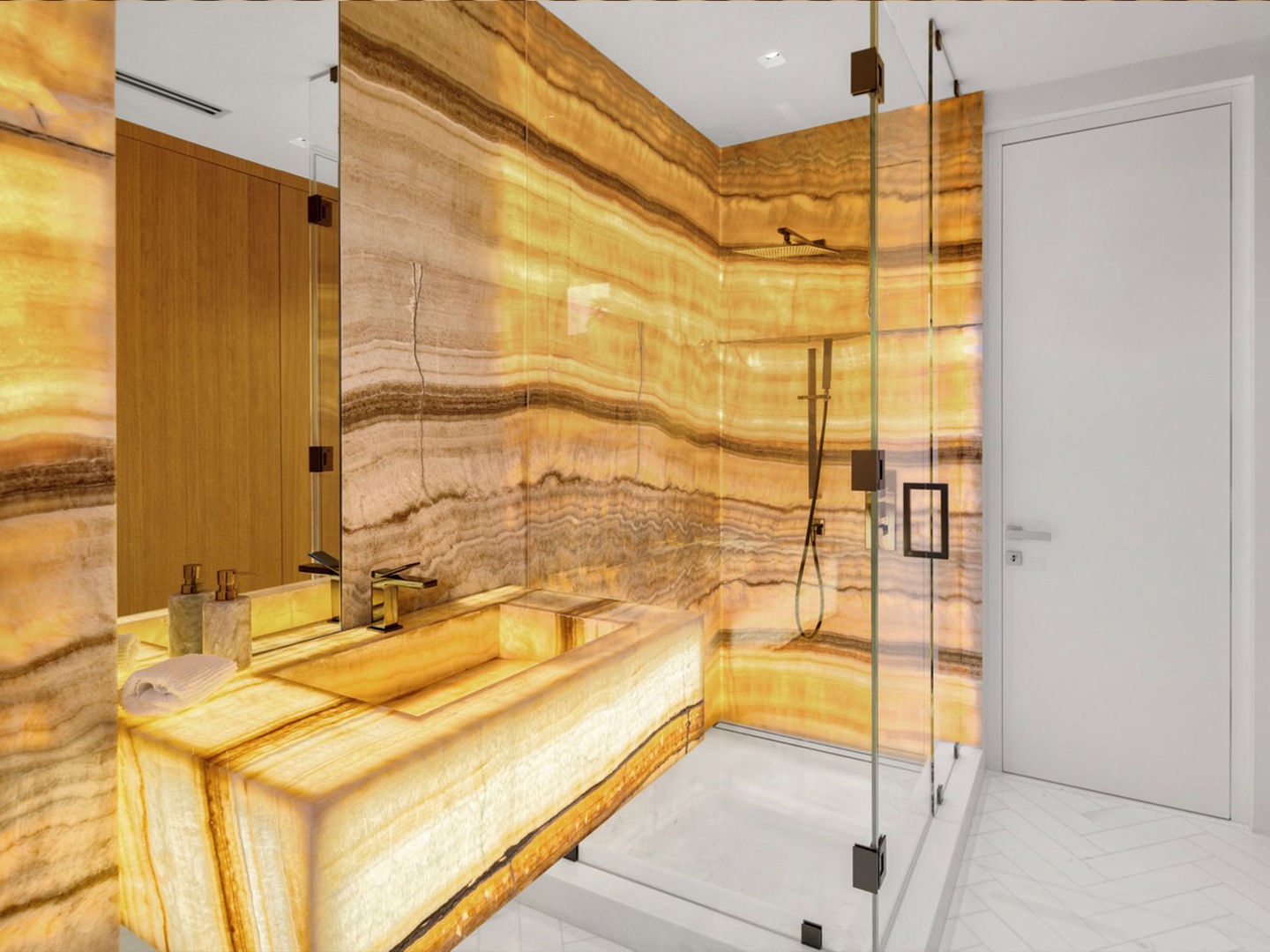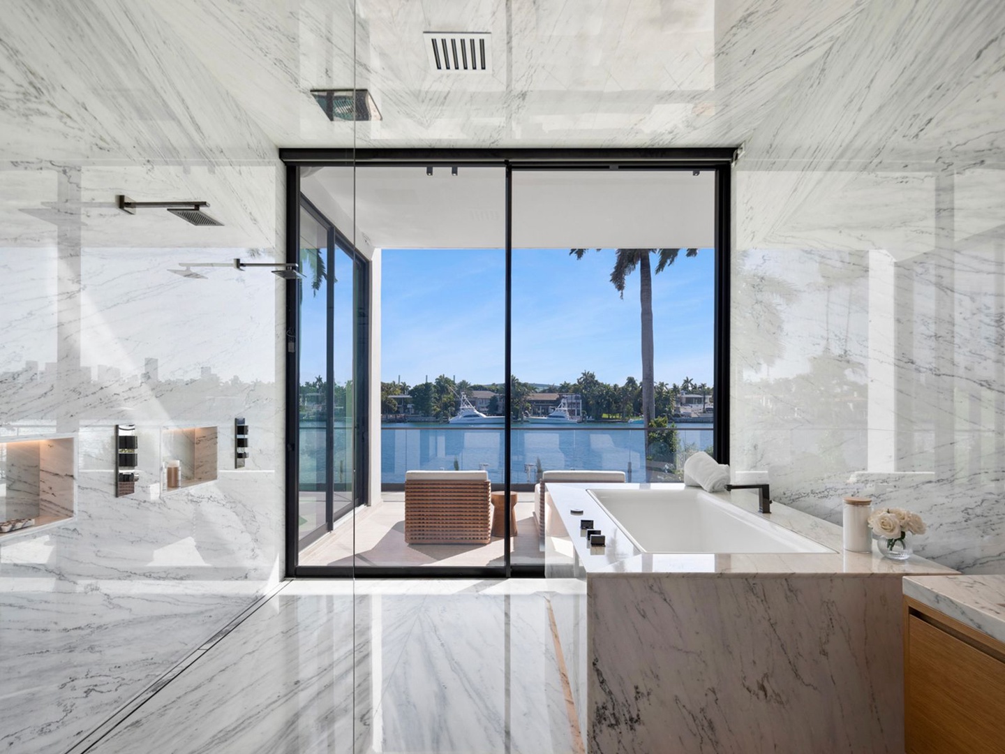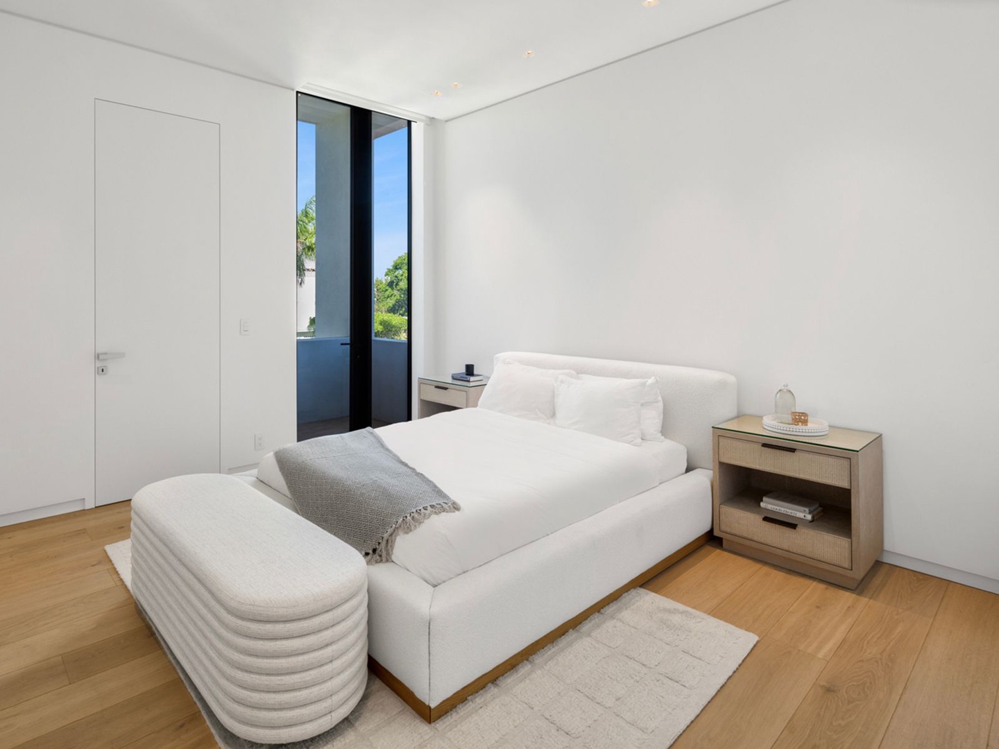 A sculptural floating staircase ascends to an executive office and four impeccably designed ensuite bedrooms, all featuring wide-plank oak flooring. The expansive primary suite is a sanctuary unto itself, offering dual lounge areas, a grand custom dressing room, a midnight bar, and a spa-style marble bath that opens to a private terrace with panoramic city views.