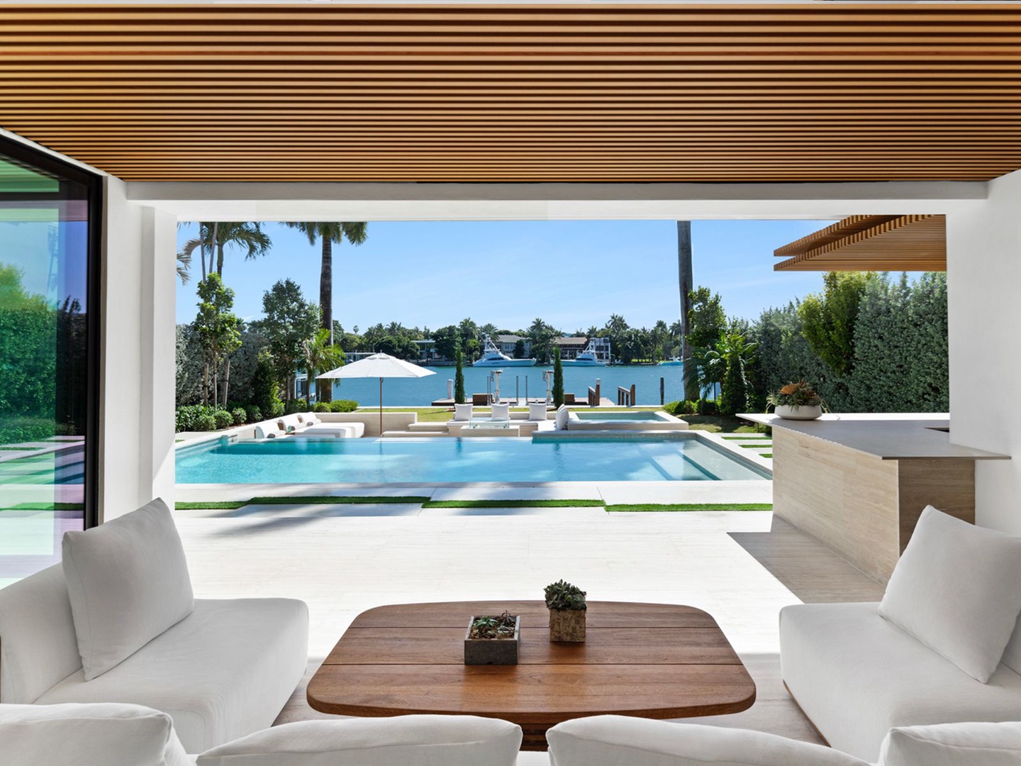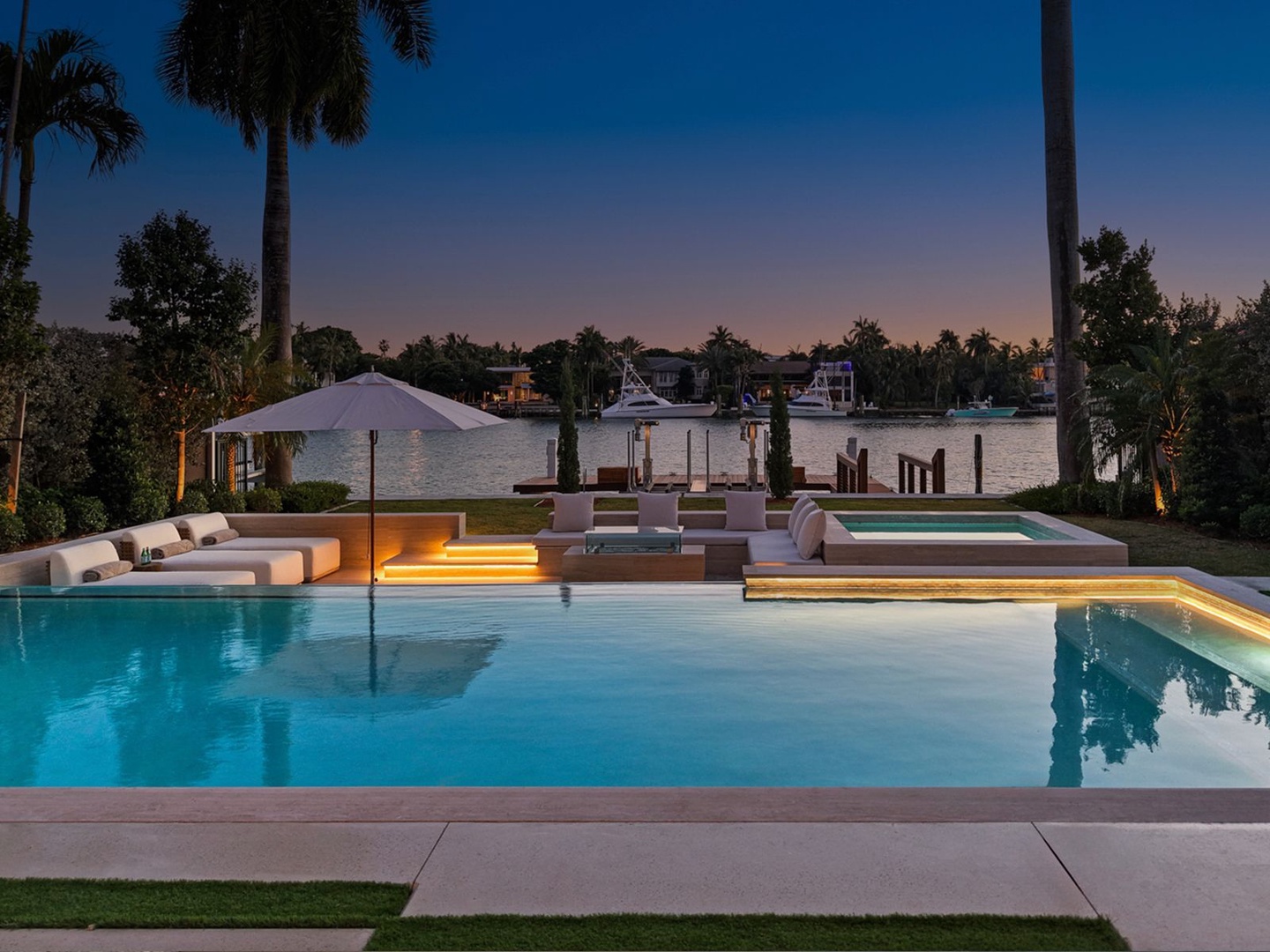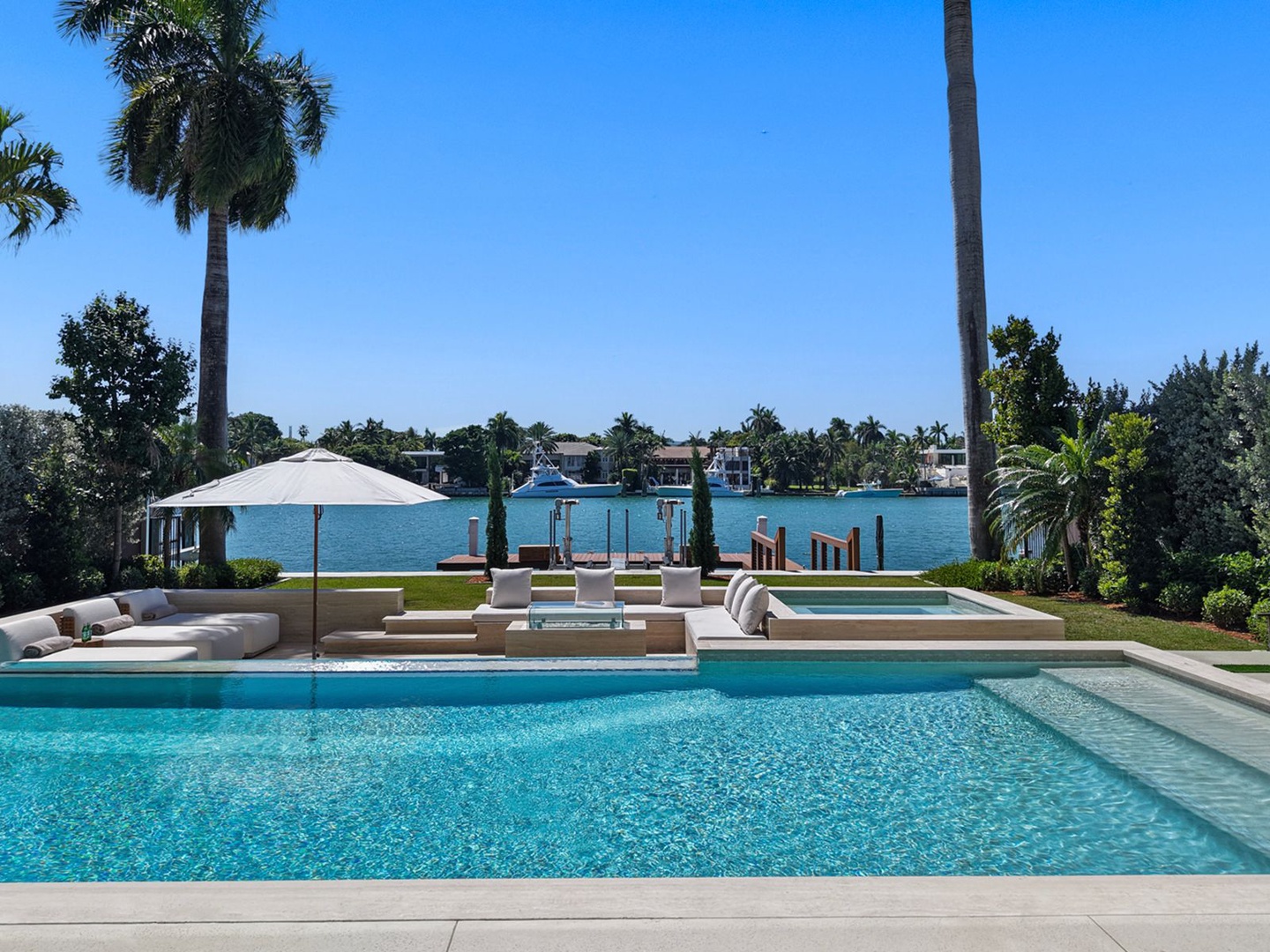 South-facing outdoor amenities embrace the essence of resort living—featuring a sparkling pool and spa, covered lounge area, summer kitchen, sunken fire pit, sundeck, and a private dock with 60 feet of direct waterfrontage.