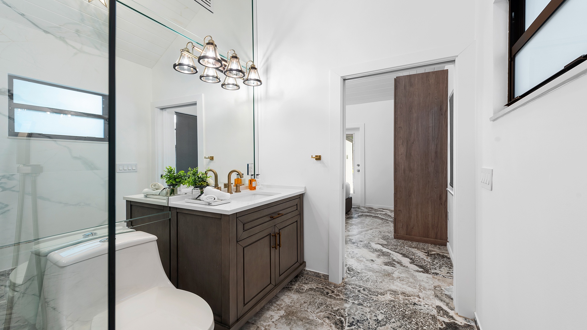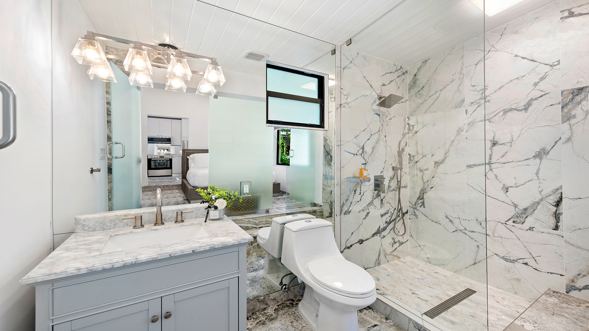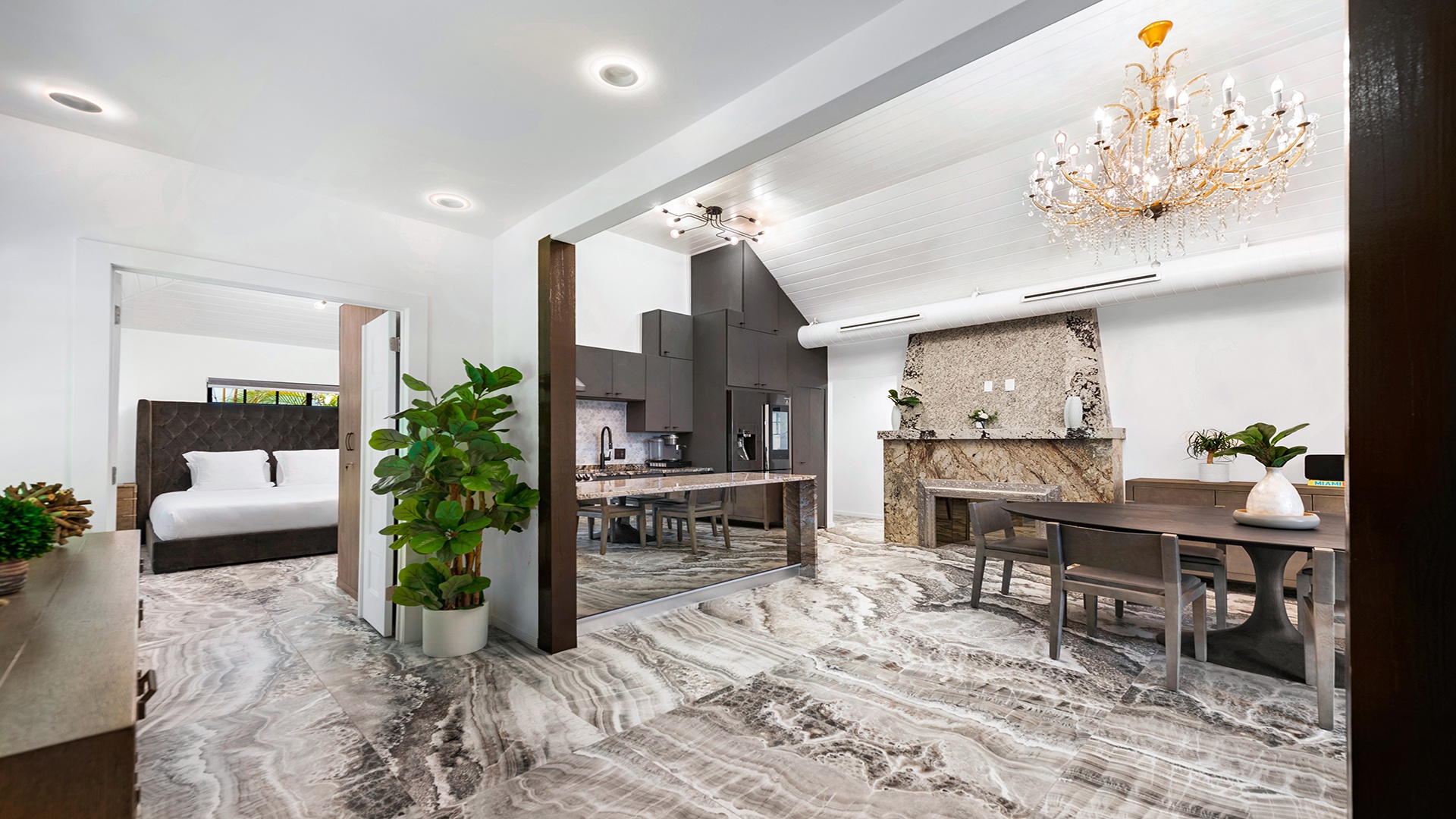 • The guest house features a full kitchen, private bedroom, and bathroom.