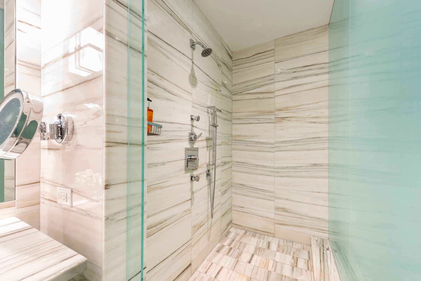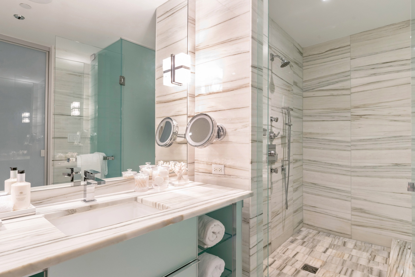 The one-bedroom residence offers a chic urban retreat with designer finishes and panoramic views of the ocean or city skyline.